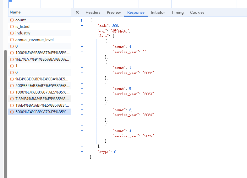 客户分类统计接口,uri:/api/statistic/customer_by_field/{field_name},返回的数据{"code":200,"msg":"操作成功","data":[{"count":1,"service_year":""}],"otype":0},service_year为空。