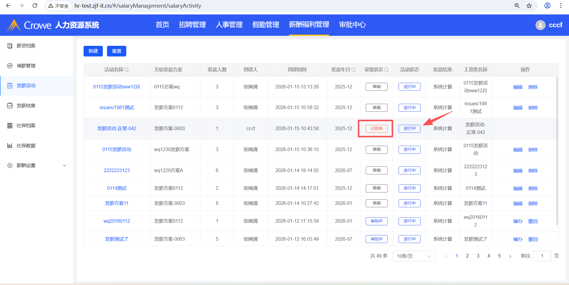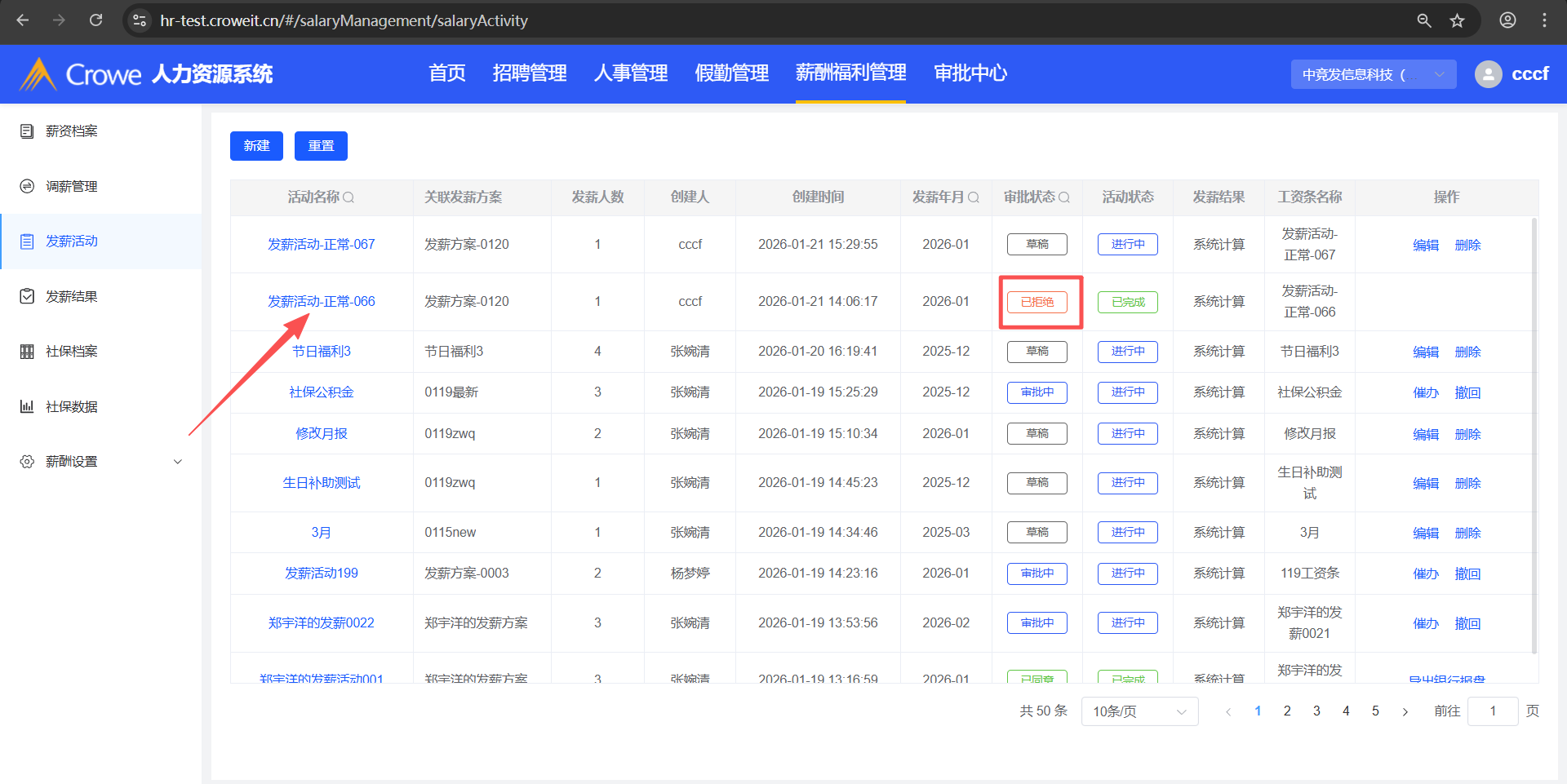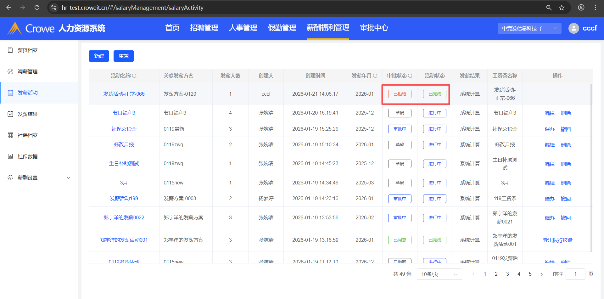 已关闭人力资源系统-薪酬福利管理-发薪活动,已拒绝的发薪活动(如:薪资组含员工张三),1、活动状态改为:已完成,2、重新新建发薪活动仍可以选择薪资组含员工张三