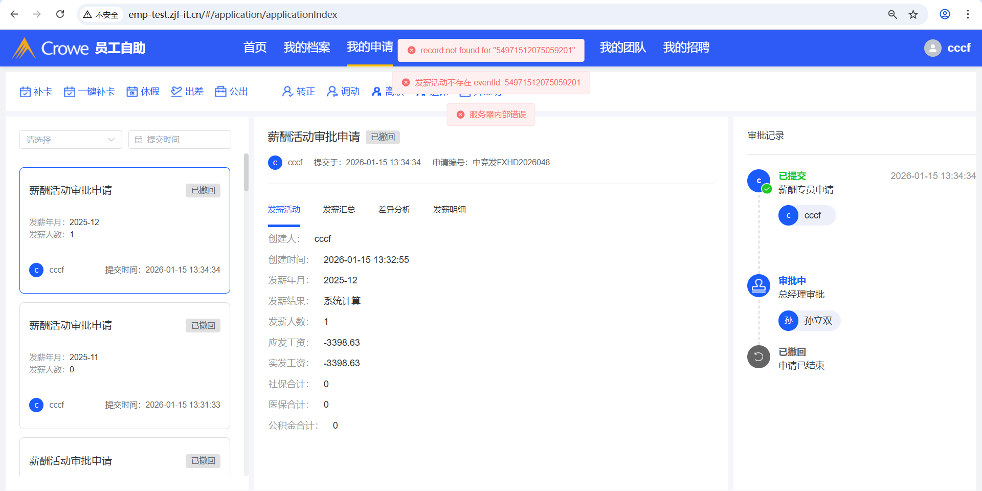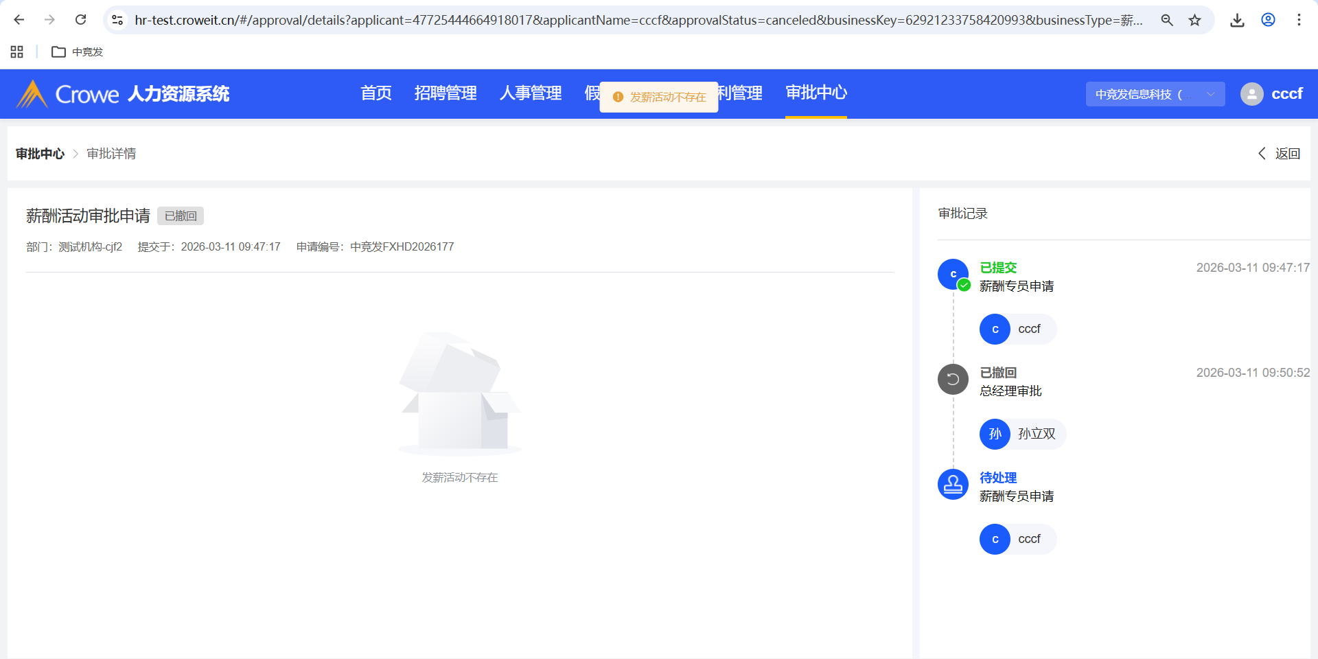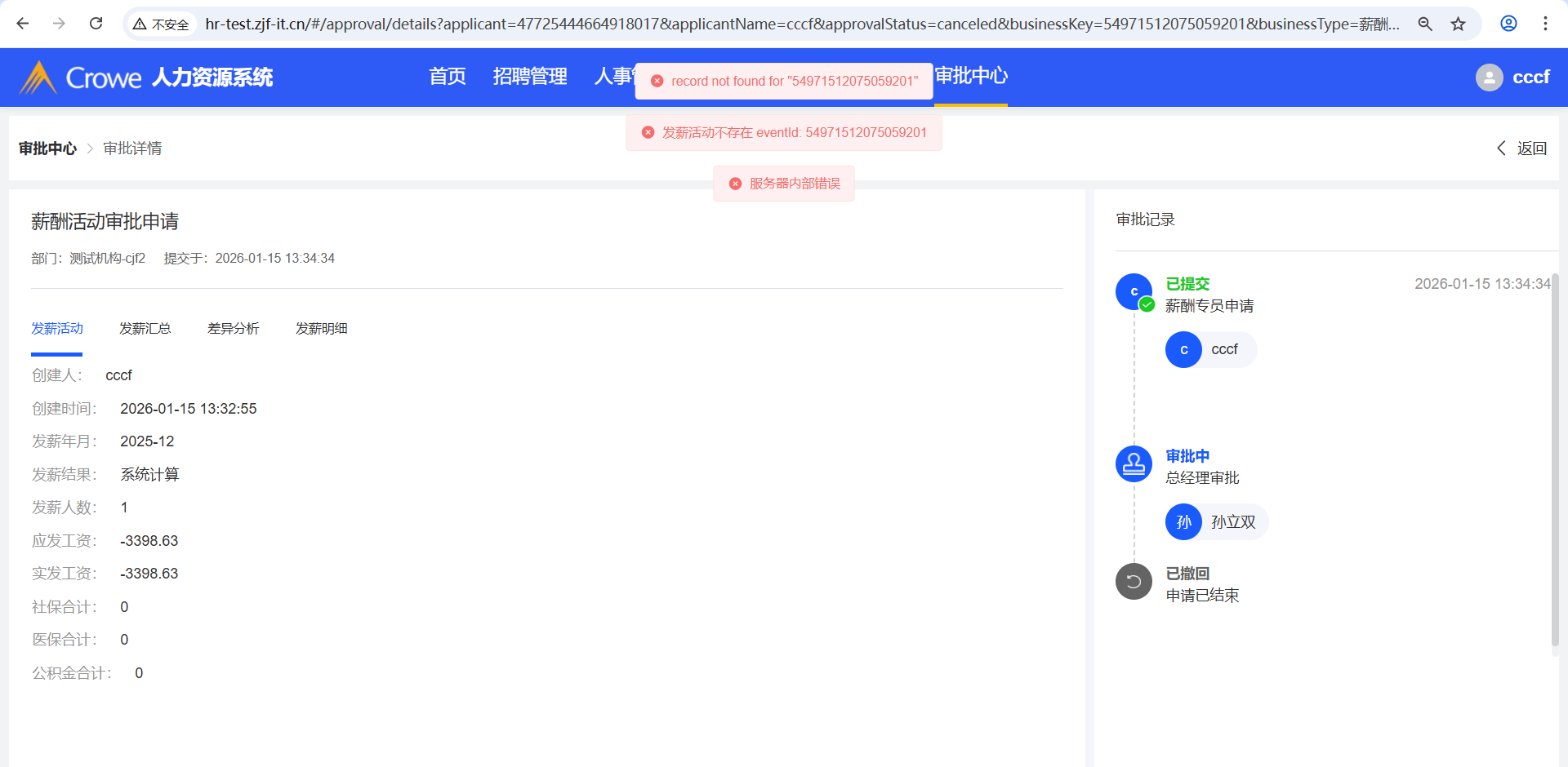 人力资源系统-薪酬福利管理-发薪活动,已撤回的发薪活动删除,进入审批中心详情、员工自助-我的申请 会报错