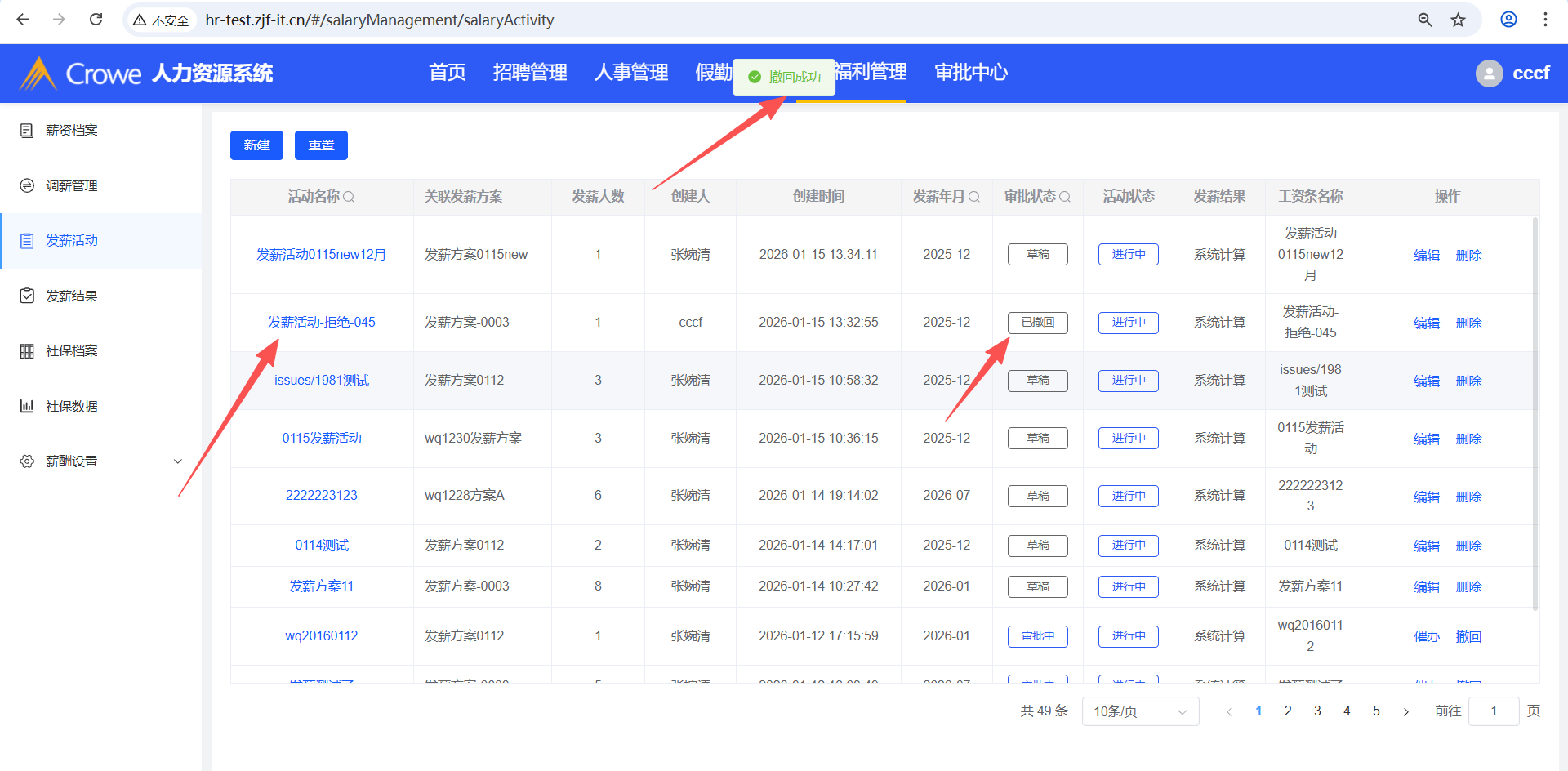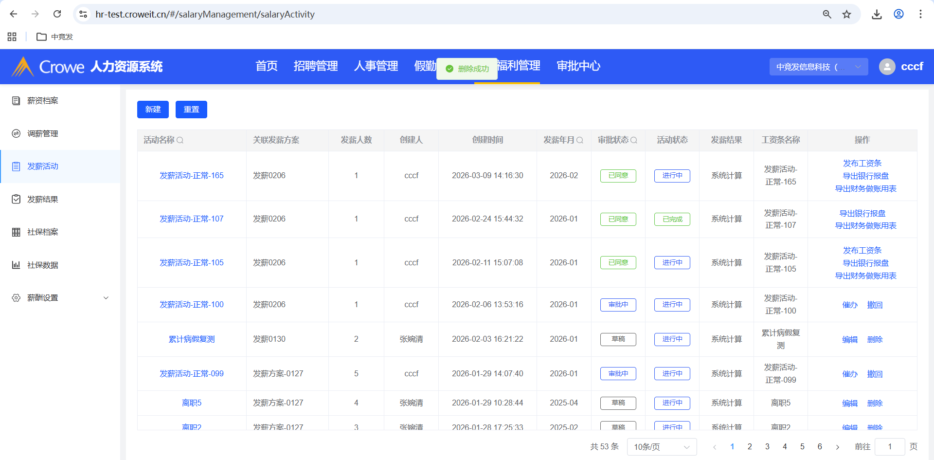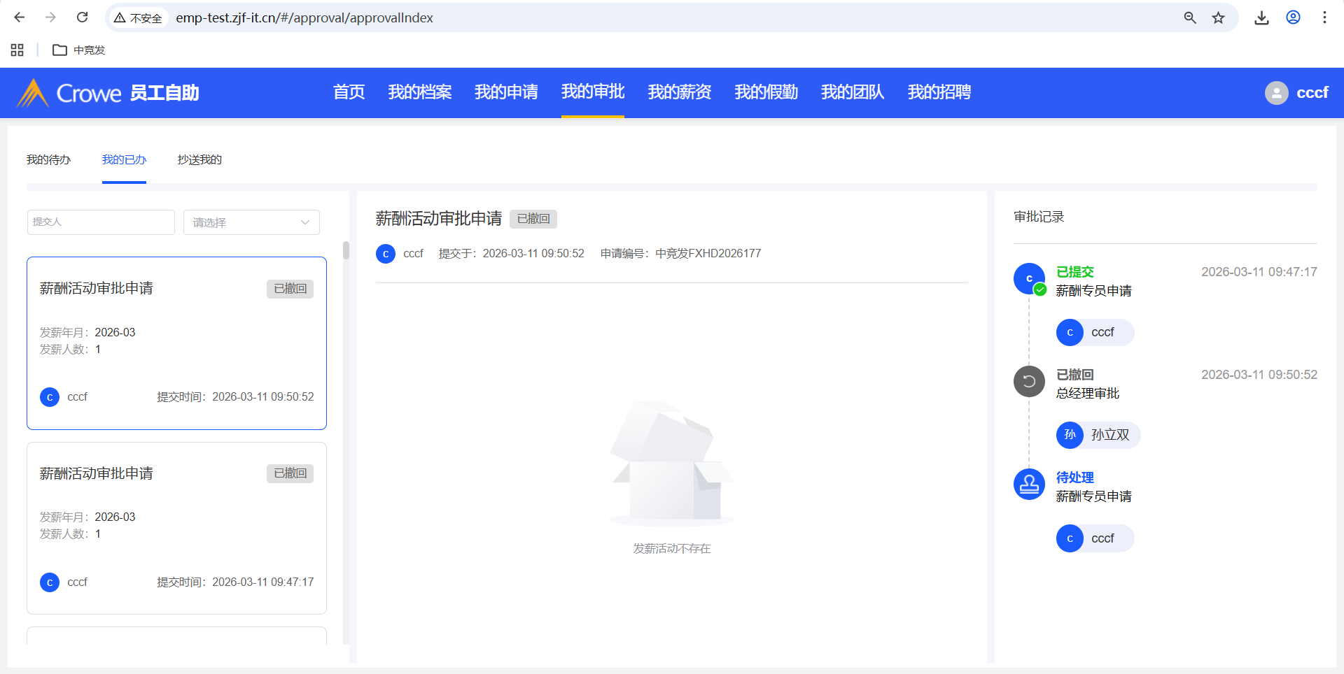 人力资源系统-薪酬福利管理-发薪活动,已撤回的发薪活动删除,进入审批中心详情、员工自助-我的申请 会报错