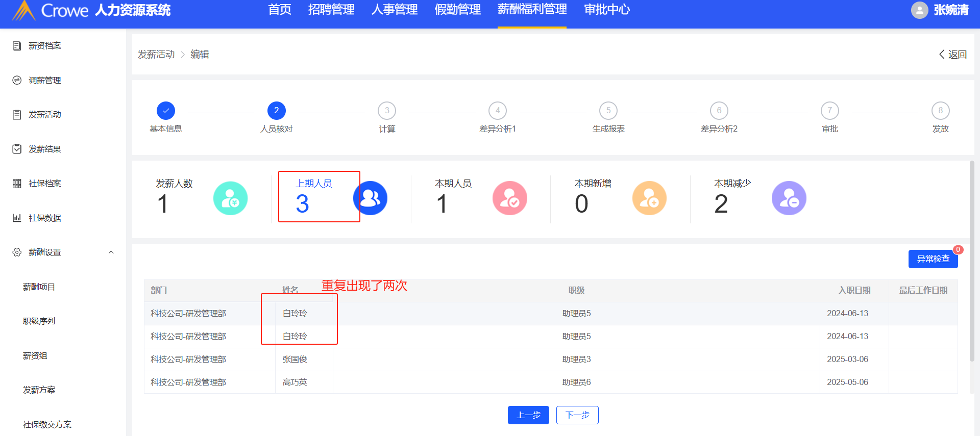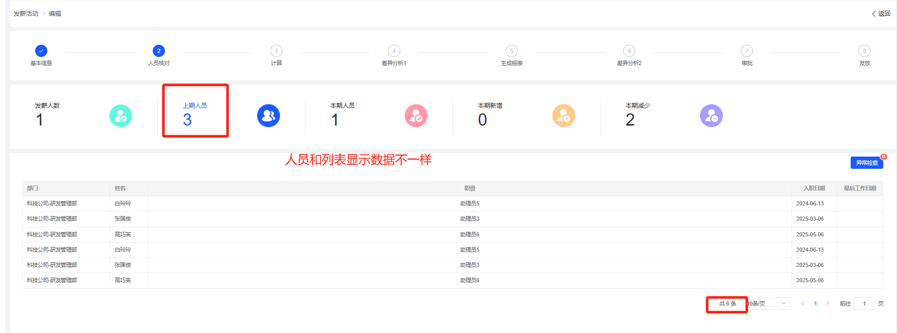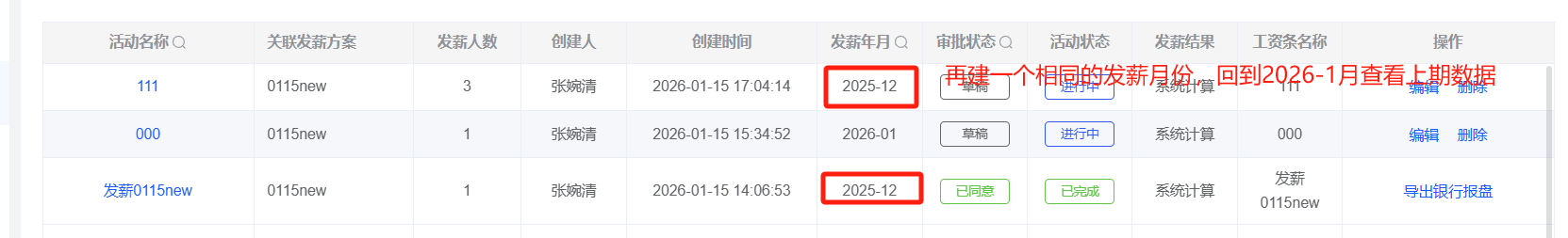 薪酬福利管理-发薪活动:发薪方案下有两个相同月份的发薪活动,上期人员中显示了两个相同的,会出现人员数据和列表显示数据不一样