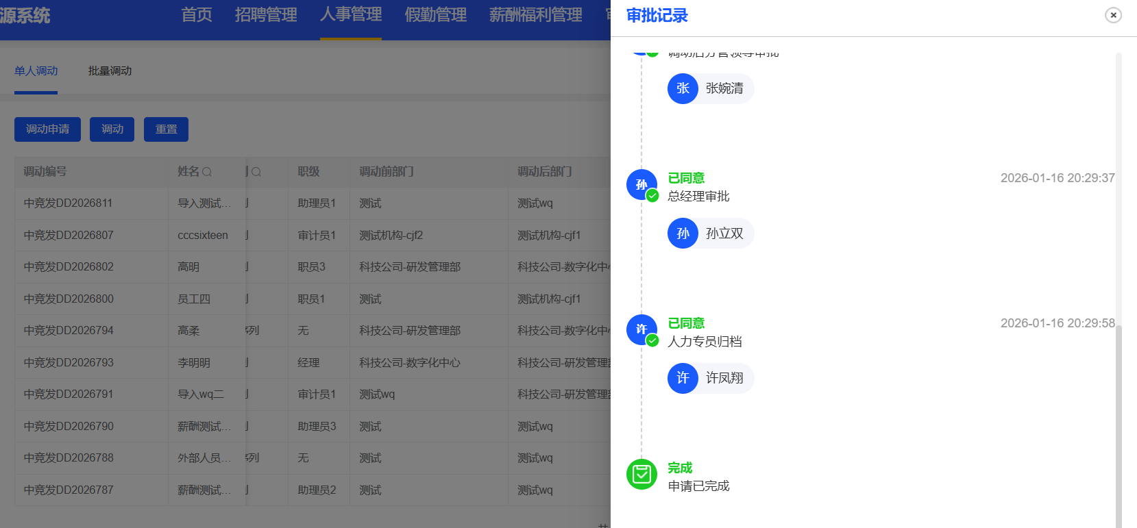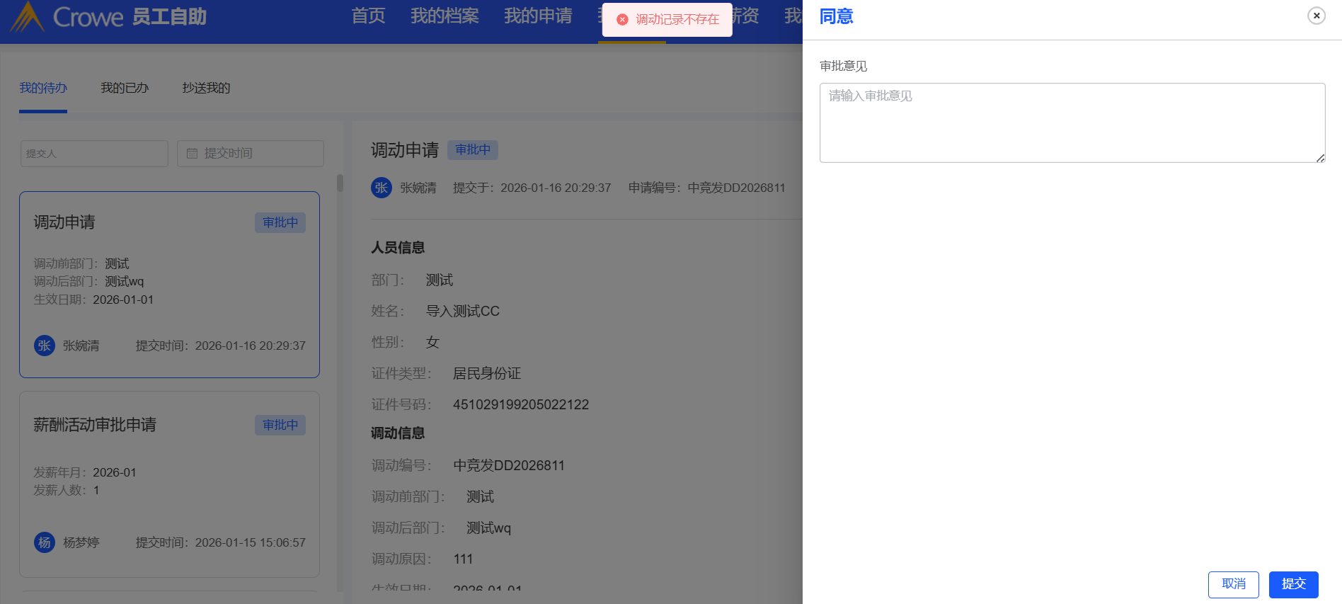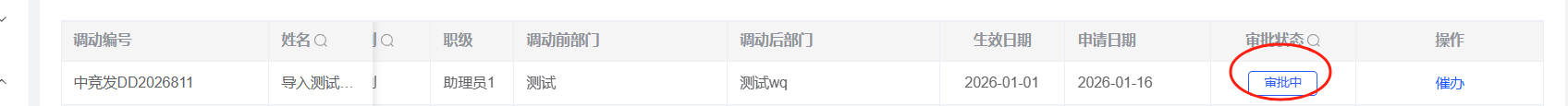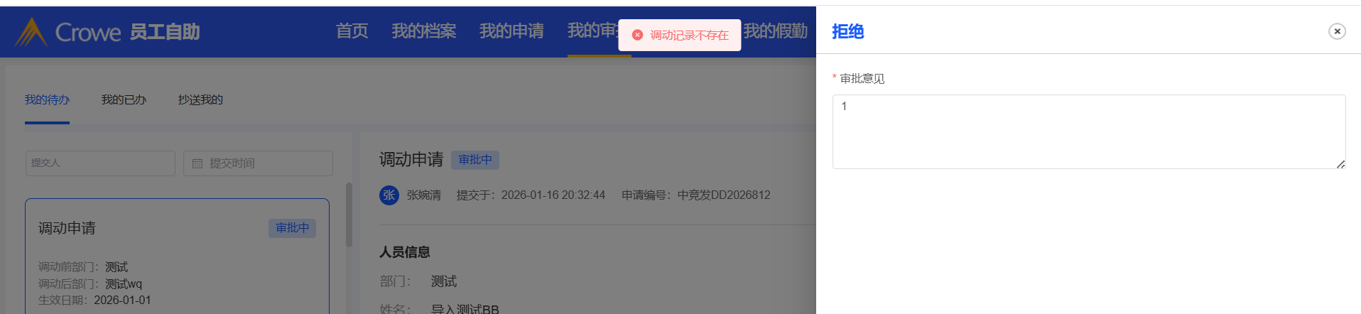 人事管理-调动管理:调动最后一个流程点击同意提示“调动记录不存在”,调动列表中仍显示审批中
