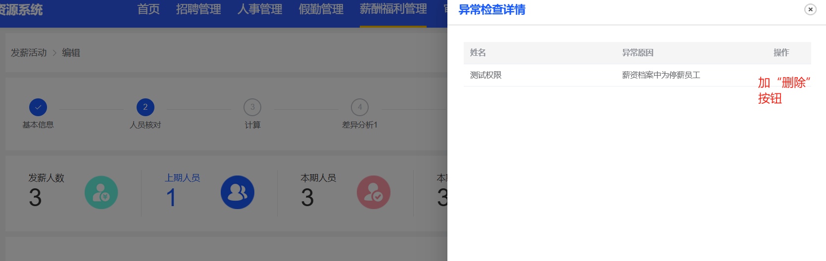 薪酬福利管理-发薪活动:异常检查中,待停薪员工不用提示;停薪员工列表的操作后加删除按钮