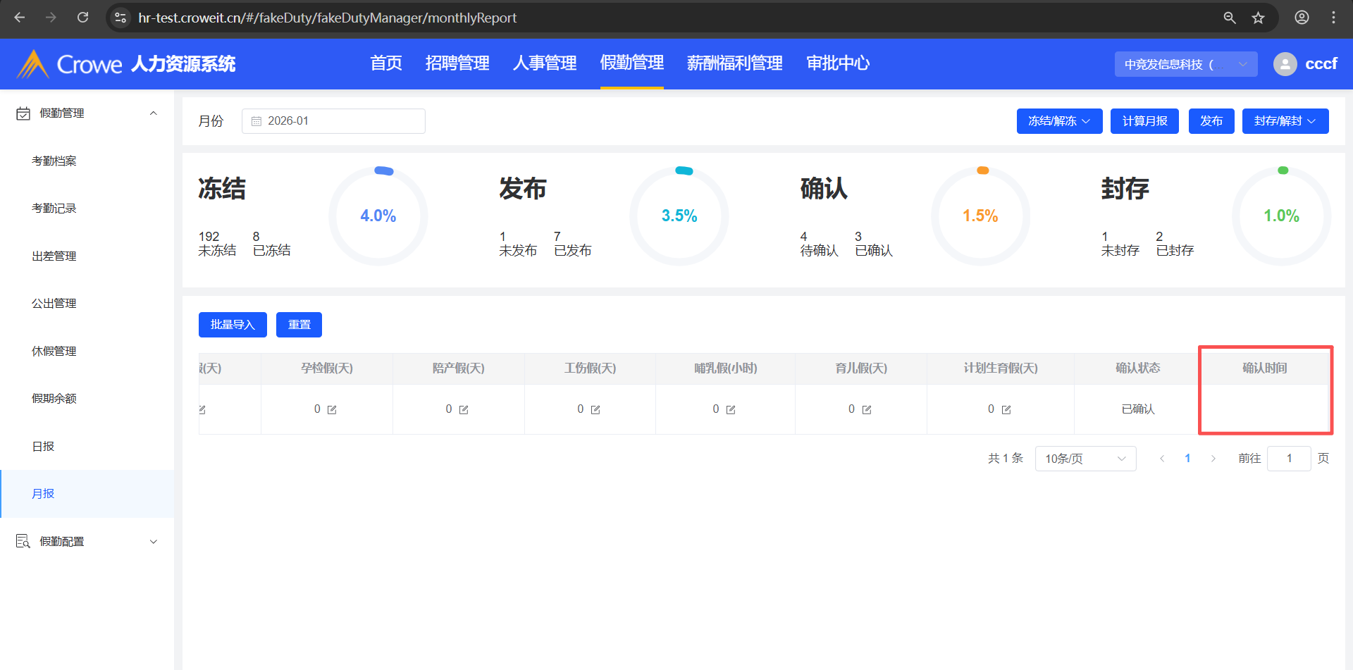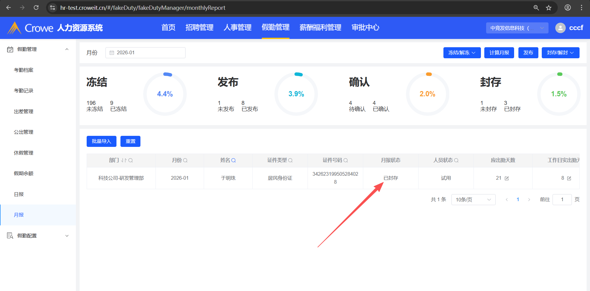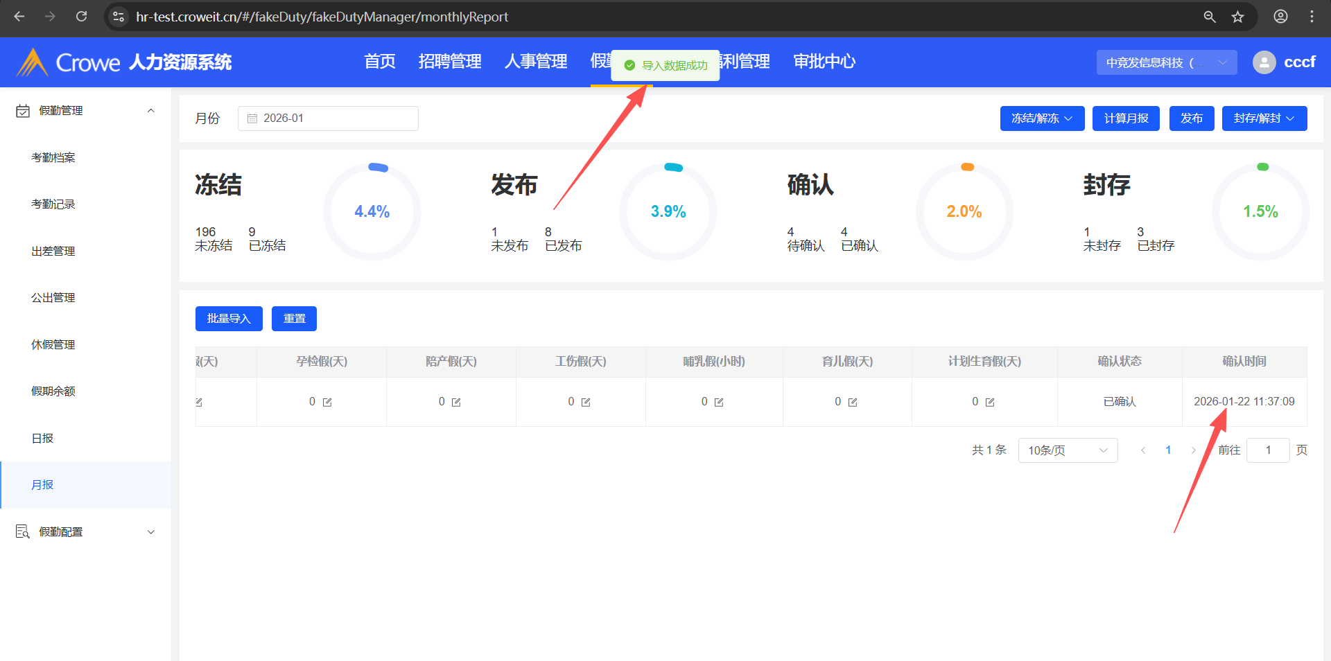 已关闭人力资源系统-假勤管理-月报,月报导入后,1、月报状态为:已封存 2、显示确认时间,并且为导入月报文件的时间