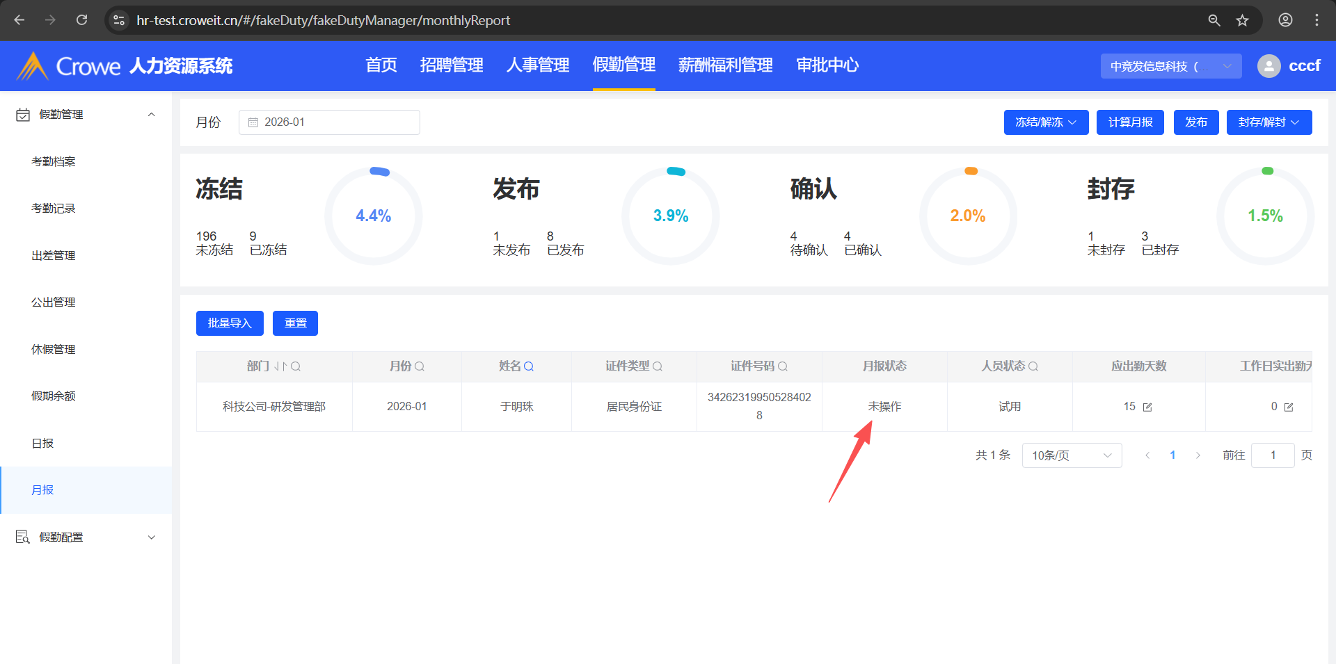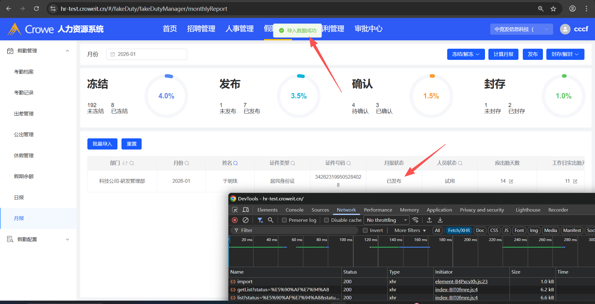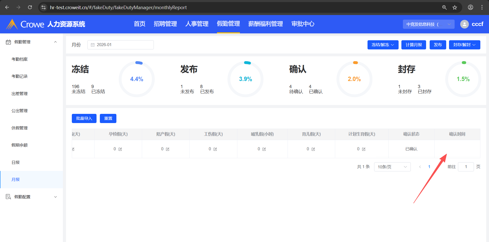 已关闭人力资源系统-假勤管理-月报,月报导入后,1、月报状态为:已封存 2、显示确认时间,并且为导入月报文件的时间