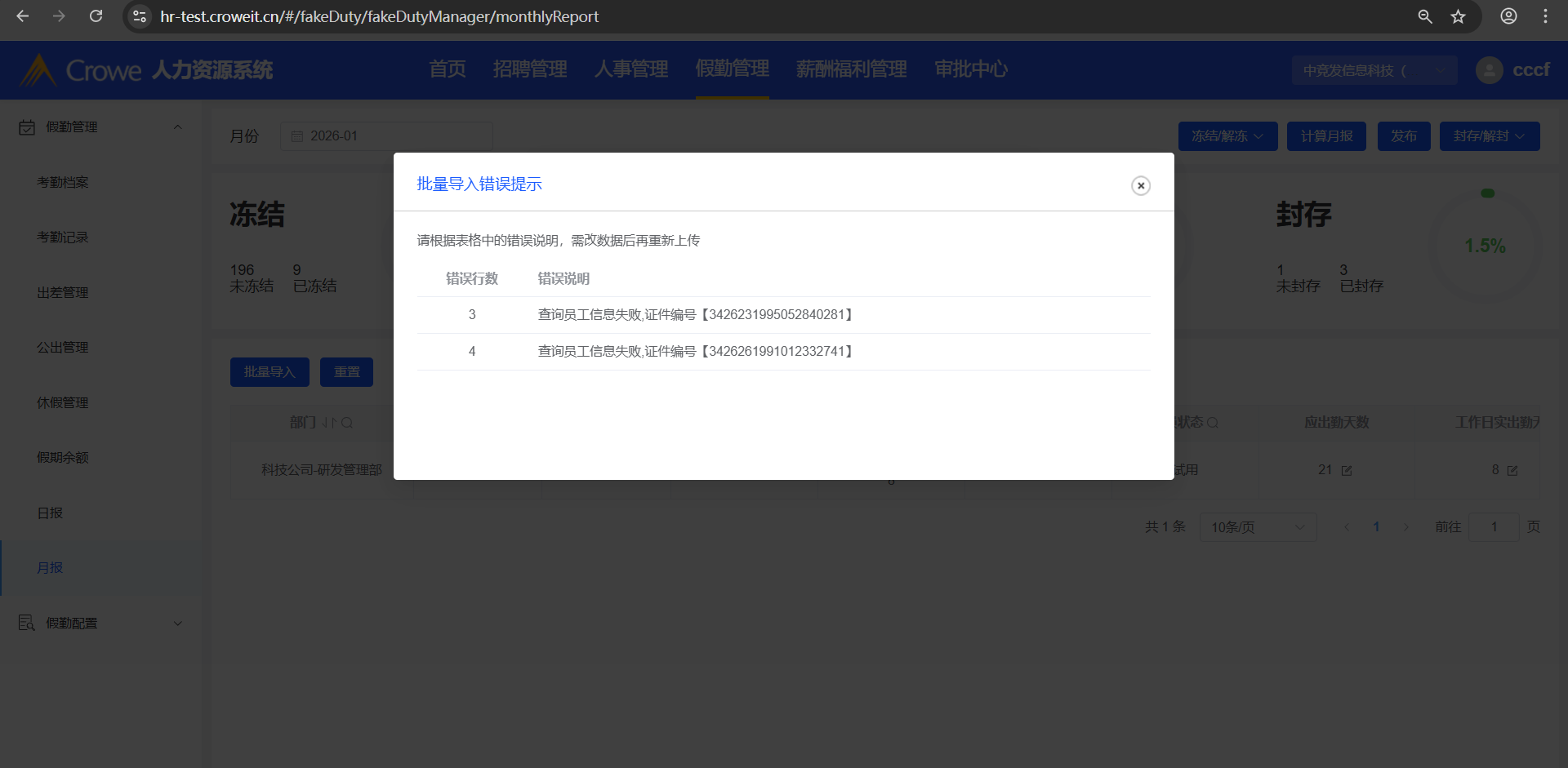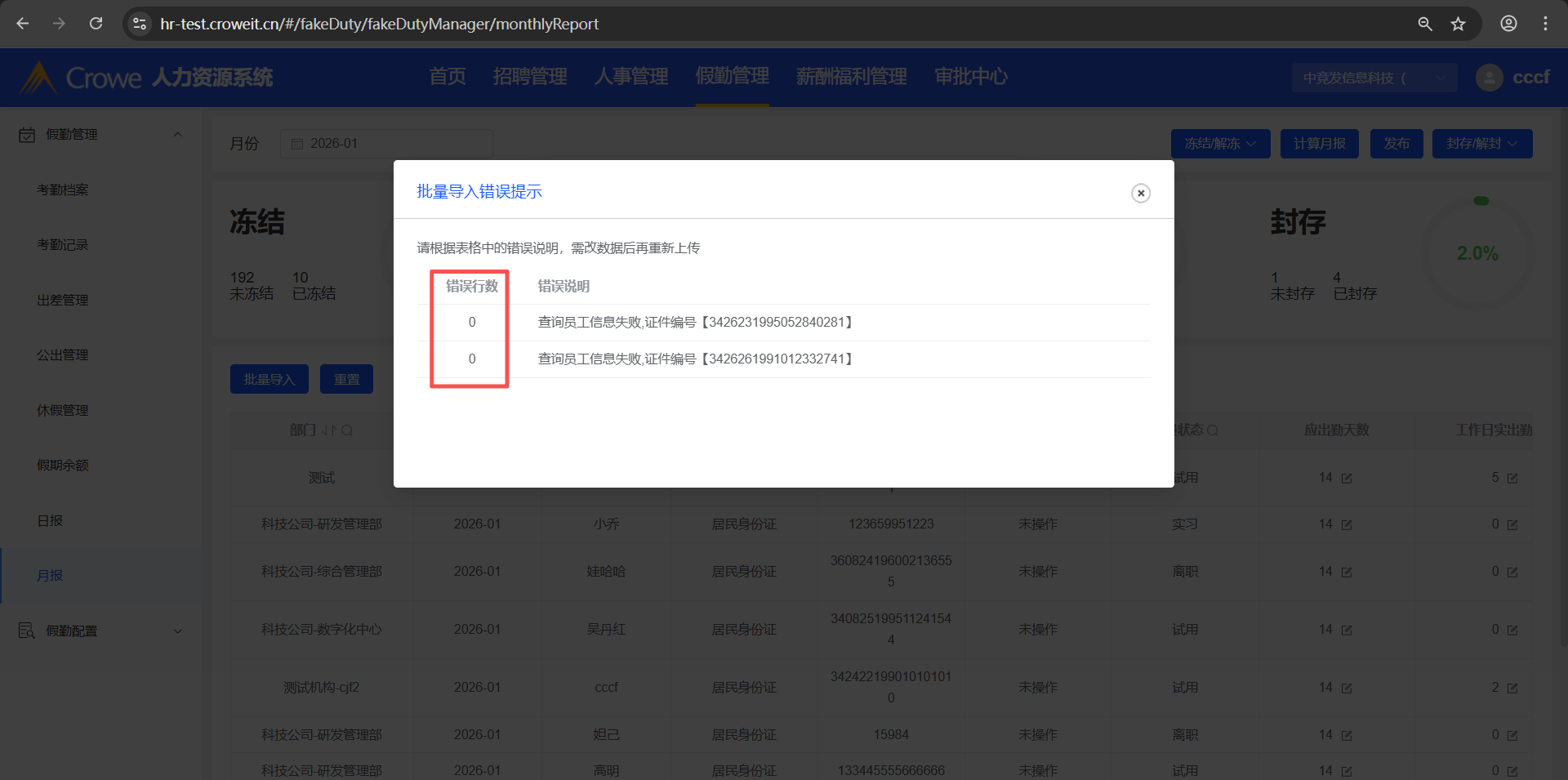 人力资源系统-假勤管理-月报,批量导入,错误提示-错误行数都显示的0,预期显示错误行数:2、3。导入的测试文件可在下面文件下载。