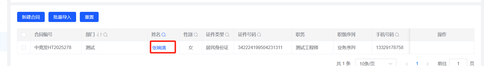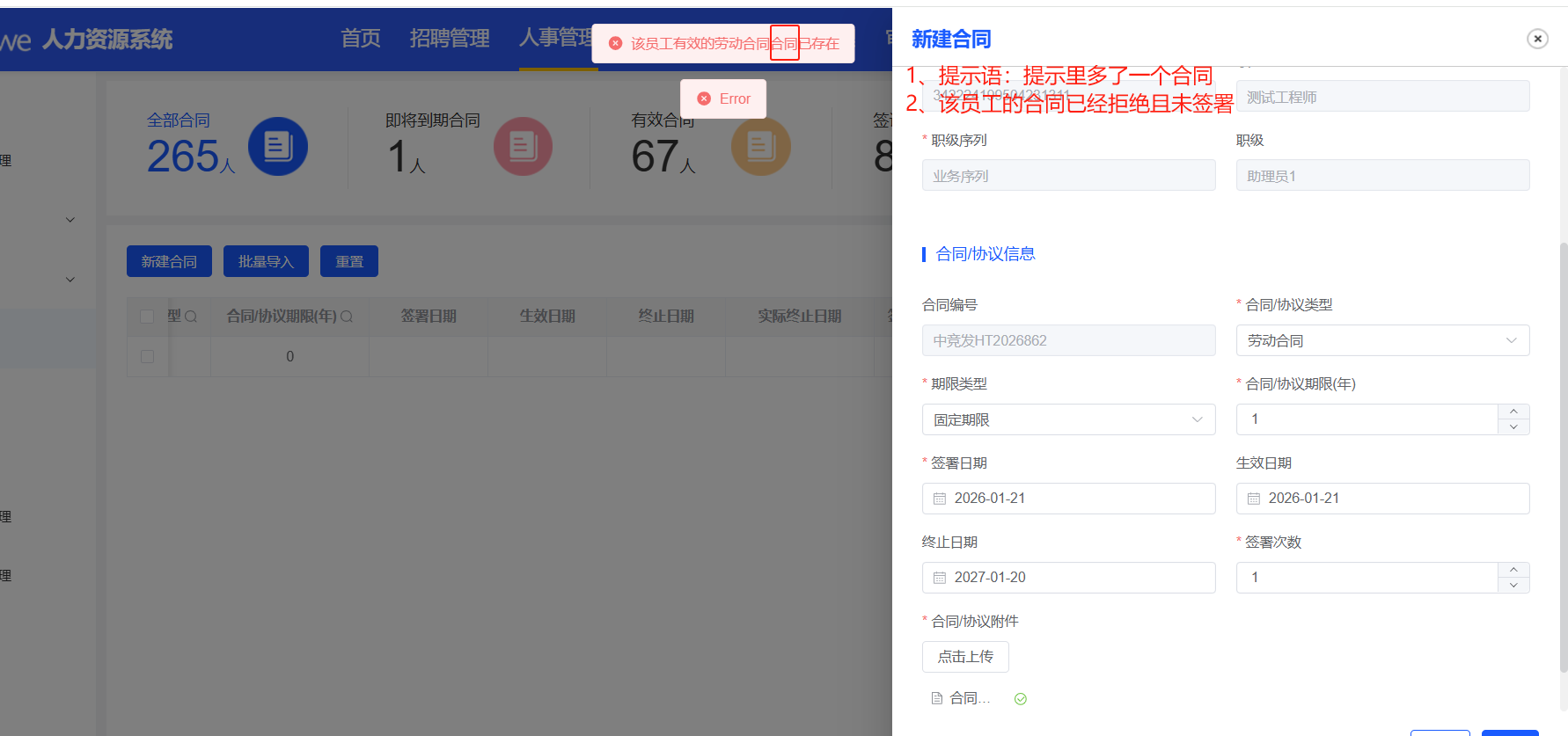 人事管理-合同管理:员工A未查到有效合同,新建合同提示已存在,且提示语需修改