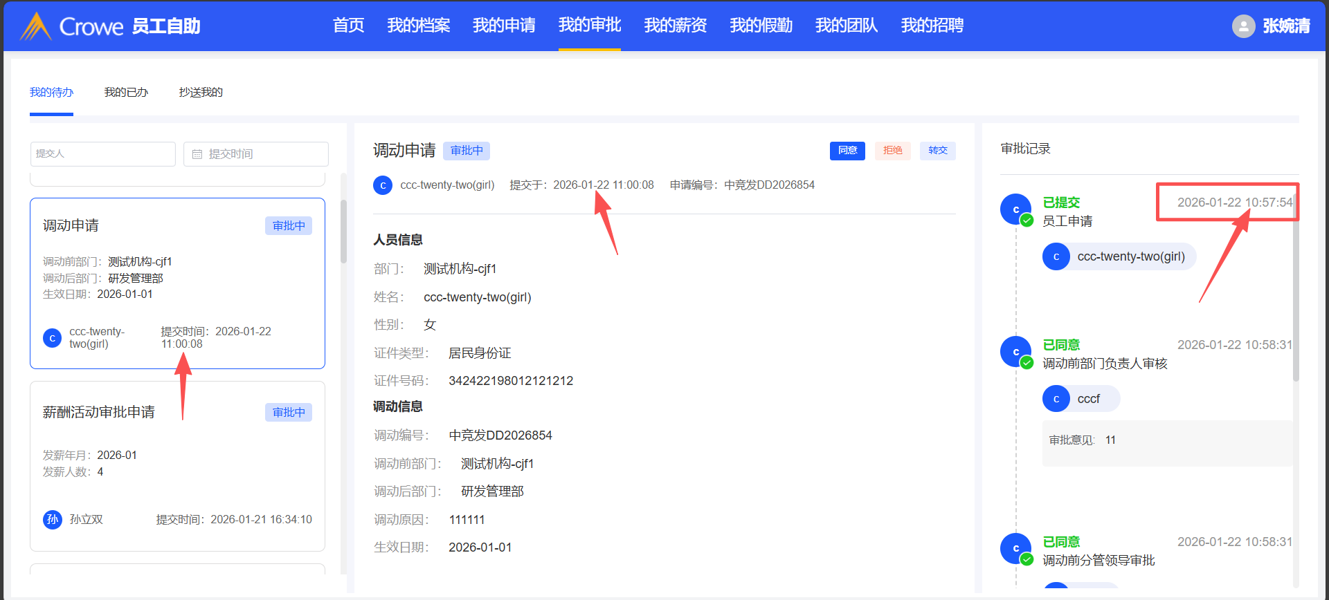员工自助调动申请后,下一个审批人的(如:张三提交申请,李四审批完后,王五审批,即王五) 员工自助-我的审批 提交时间显示不对