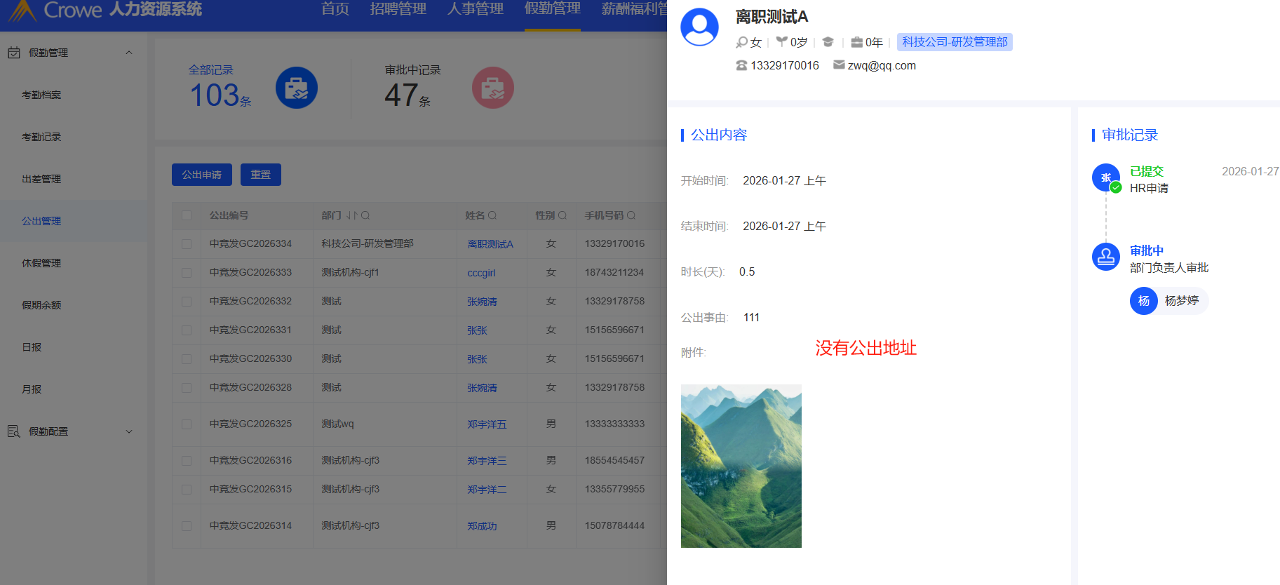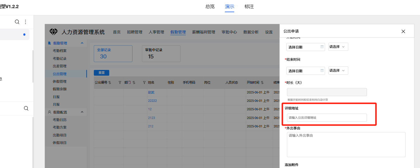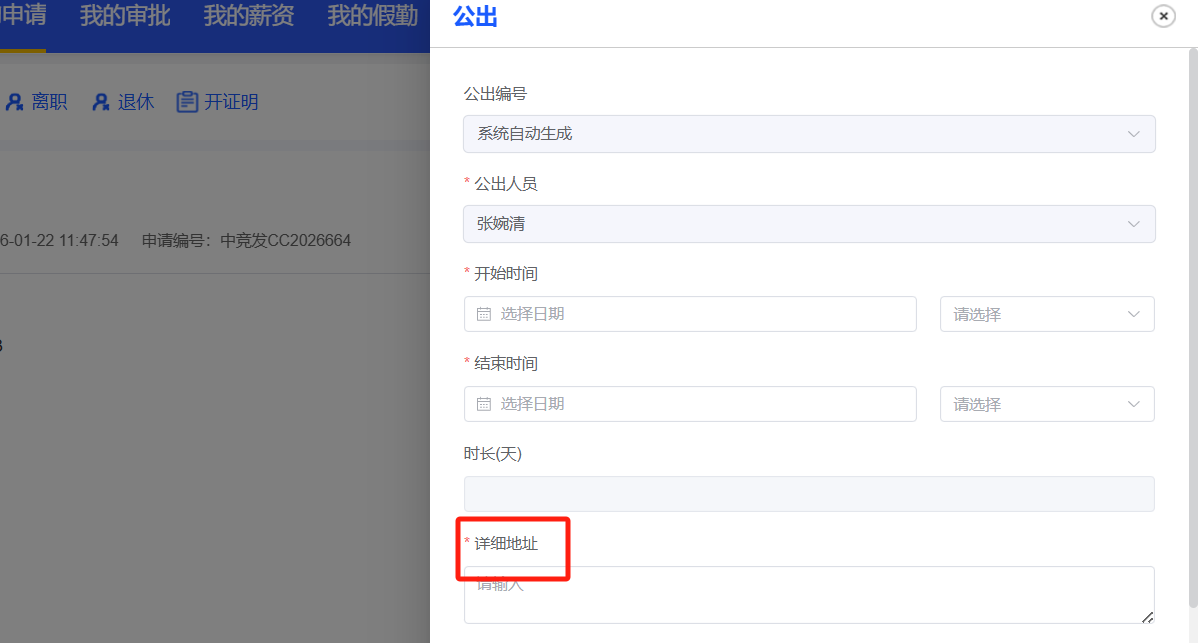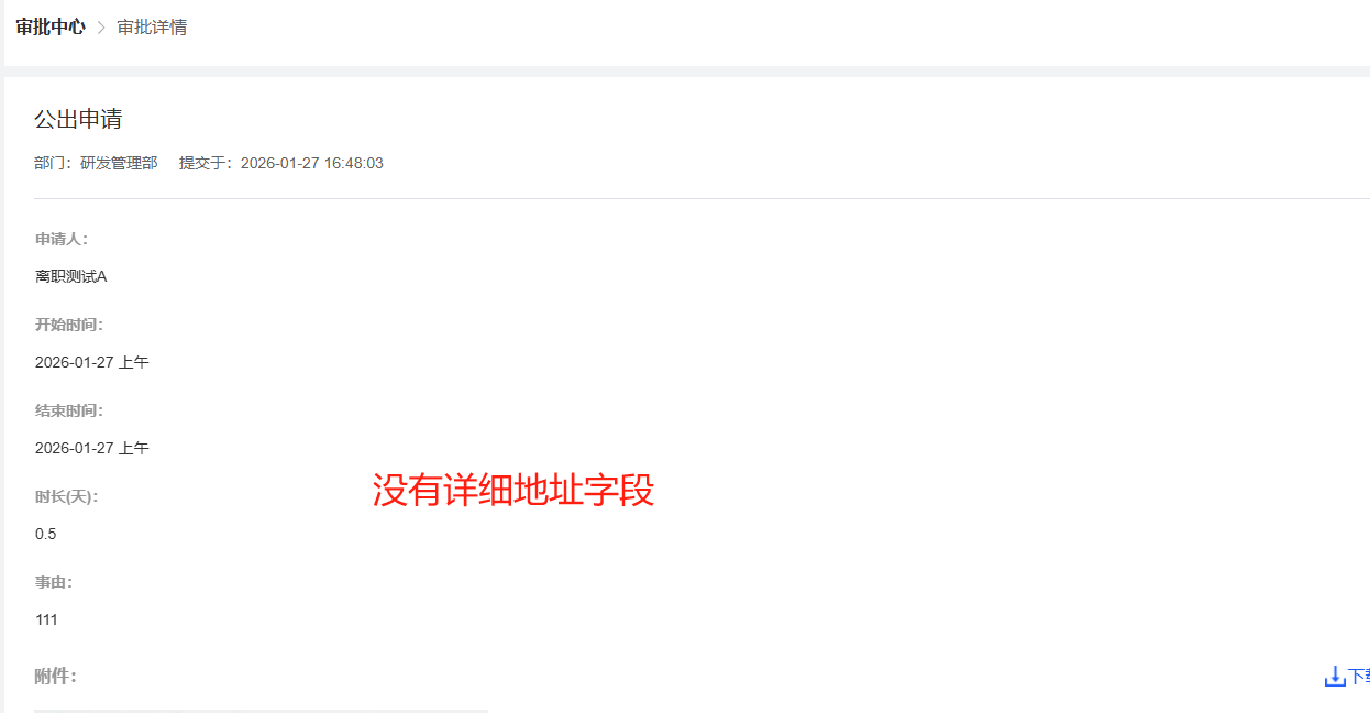 公出管理申请加了;但是点击姓名查看公出内容和审批中心的流程中均没有详细地址字段