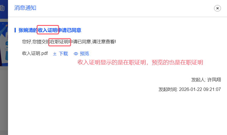 员工自助:收入证明中显示的在职证明,预览的也是在职证明