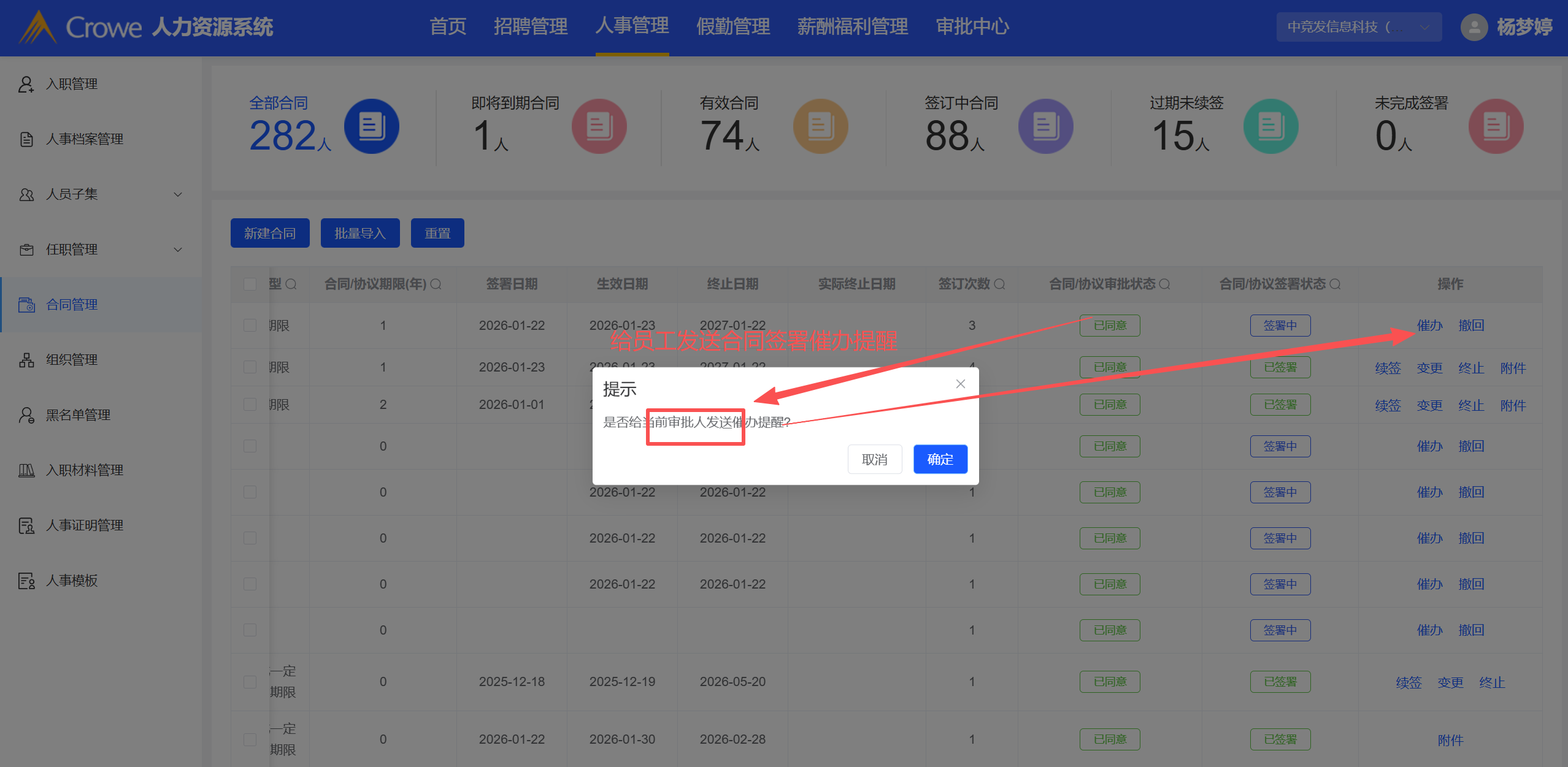 合同申请审批完成后,催办提示是给员工发起合同签署催办