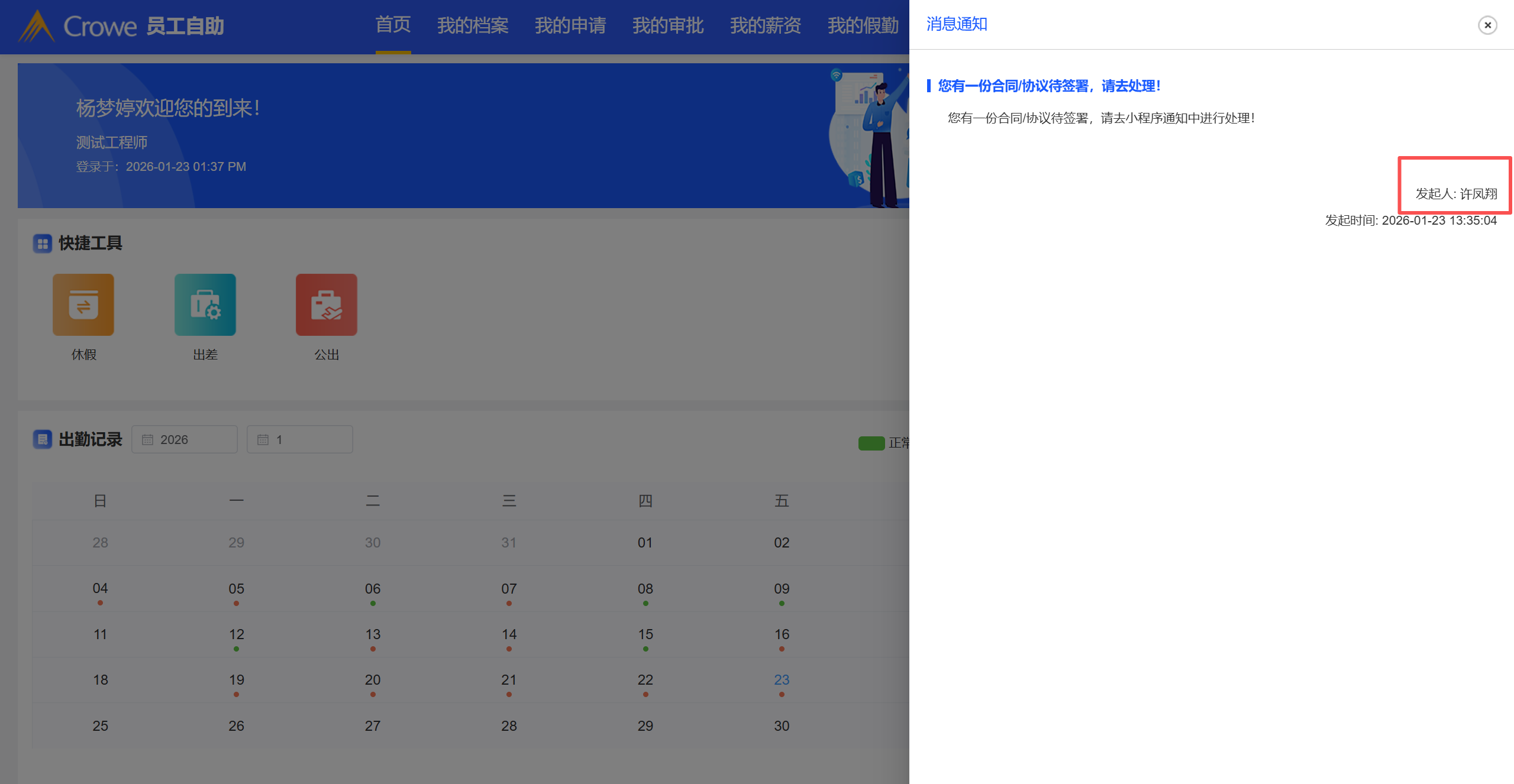 消息通知展示的发起人与人事系统发起人并非同一个人,现在默认为同一个人