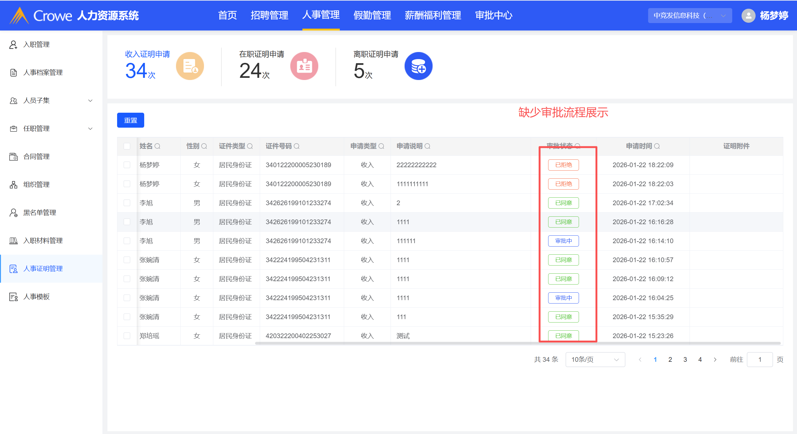人事证明管理列表中的审批状态缺少对应的审批流程展示
