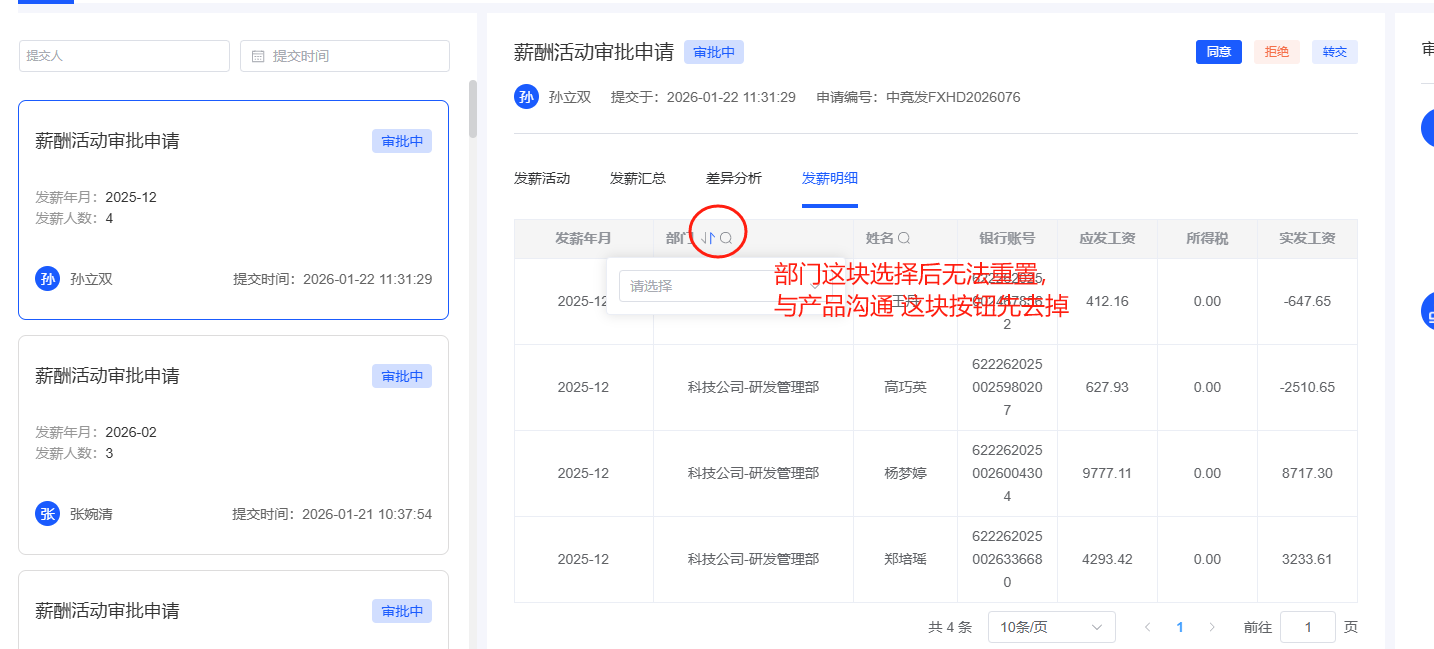 员工自助/审批中心-薪酬活动审批:发薪明细中部门选择后无法重置