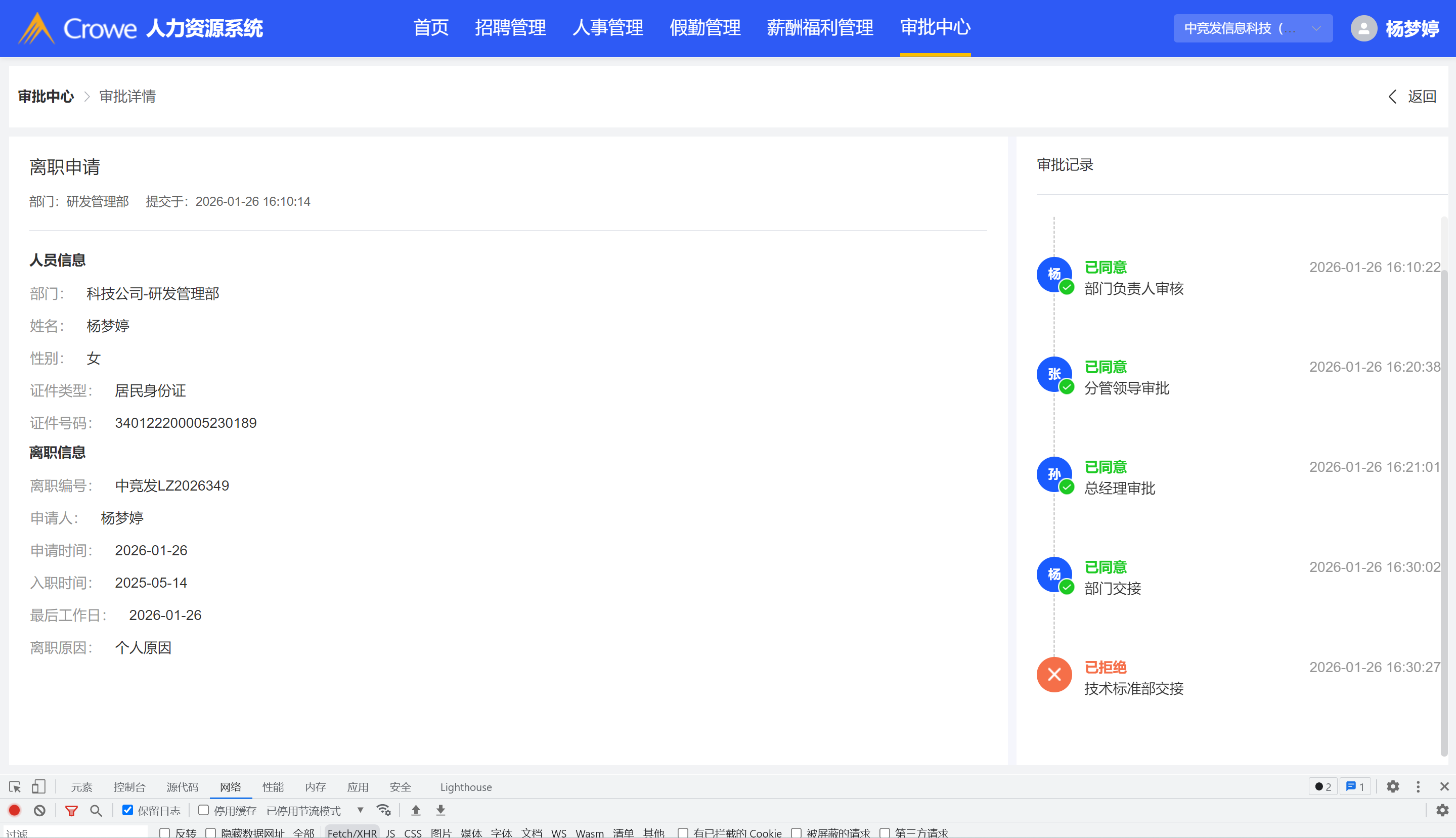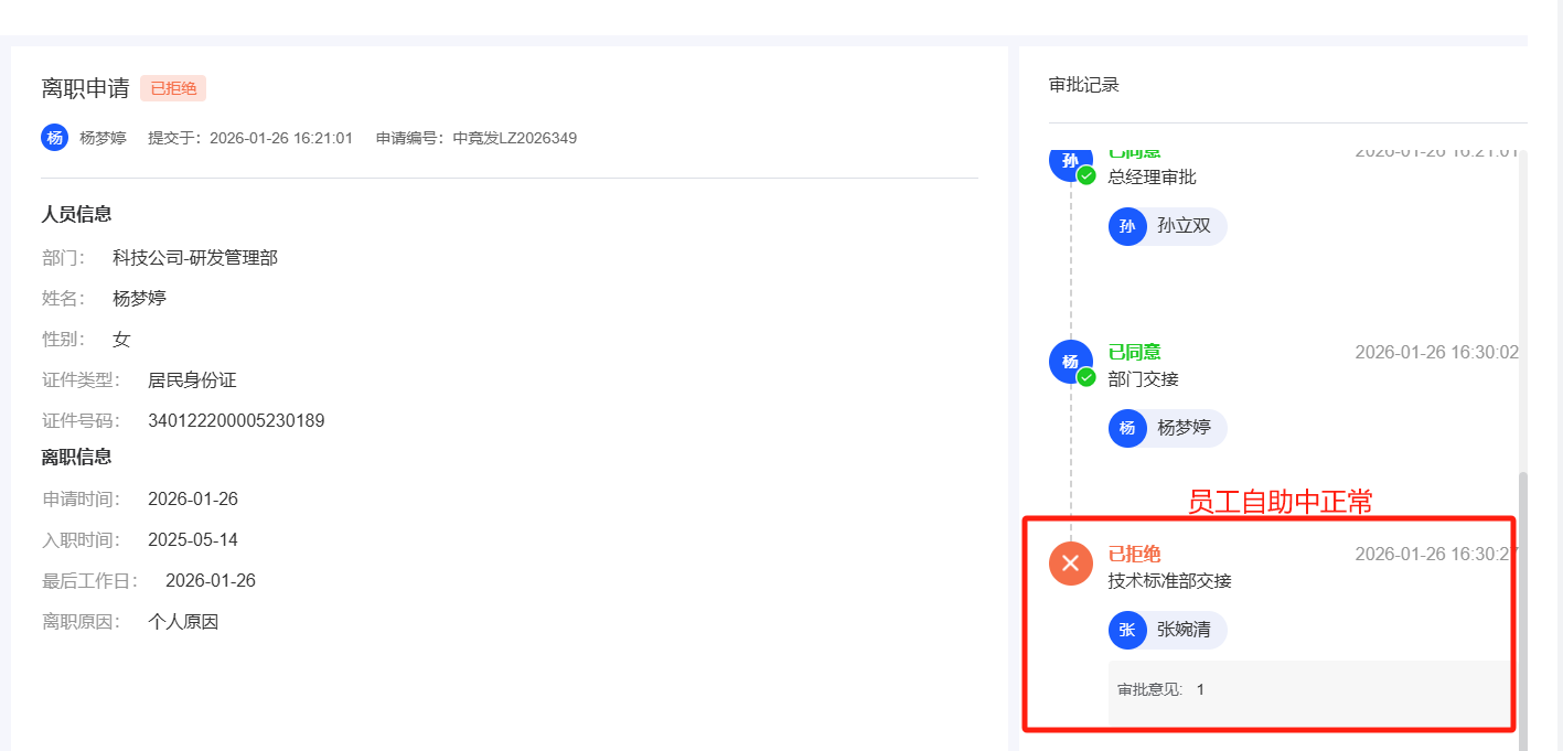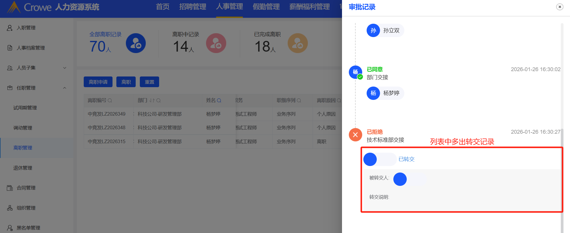 人事管理-离职管理/我的申请:已拒绝流程,查看审批记录,最后多出转交记录