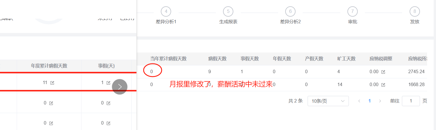月报:当年累计病假天数,月报中修改了,新建发薪活动,发薪活动中未同步修改
