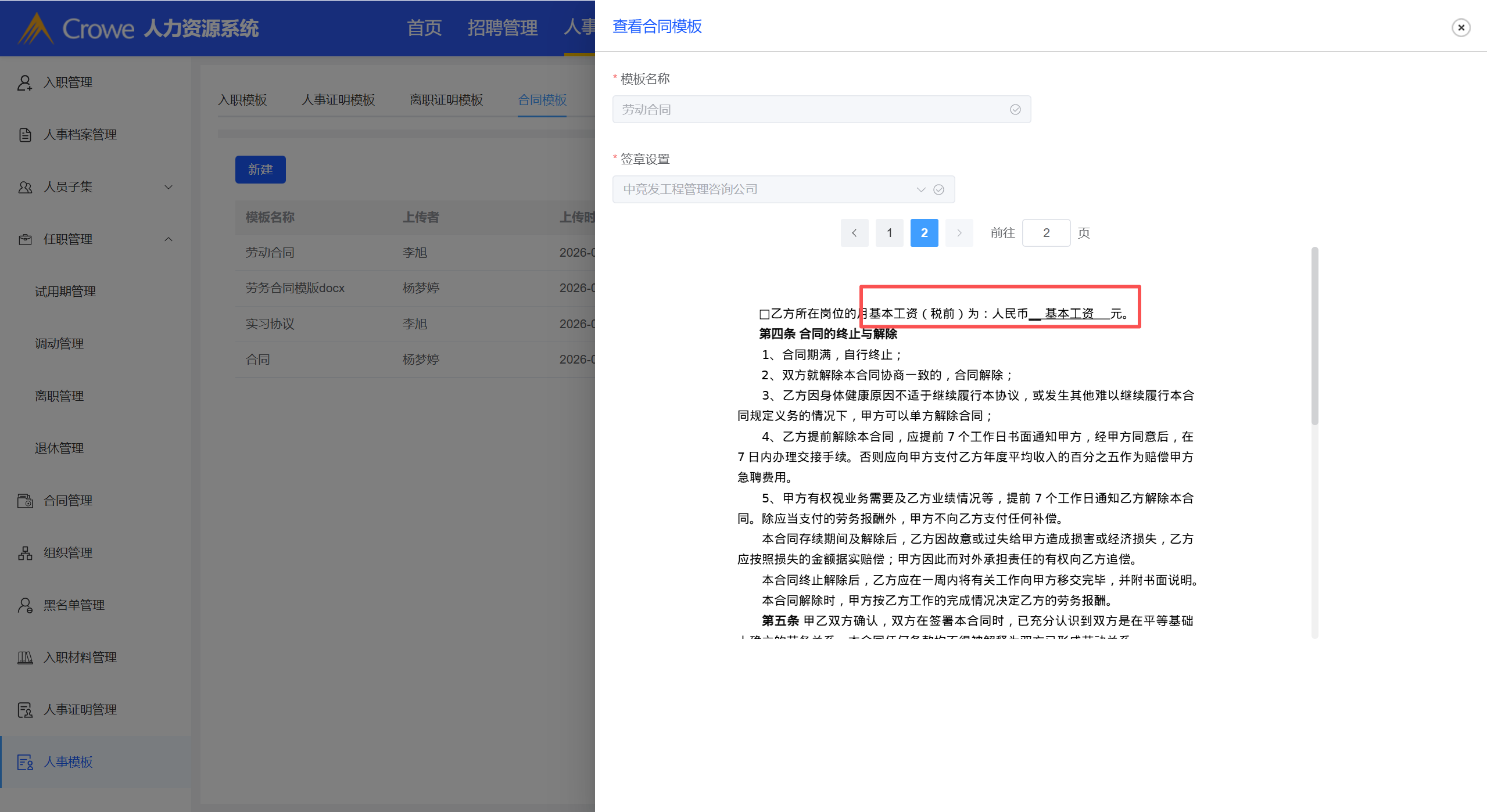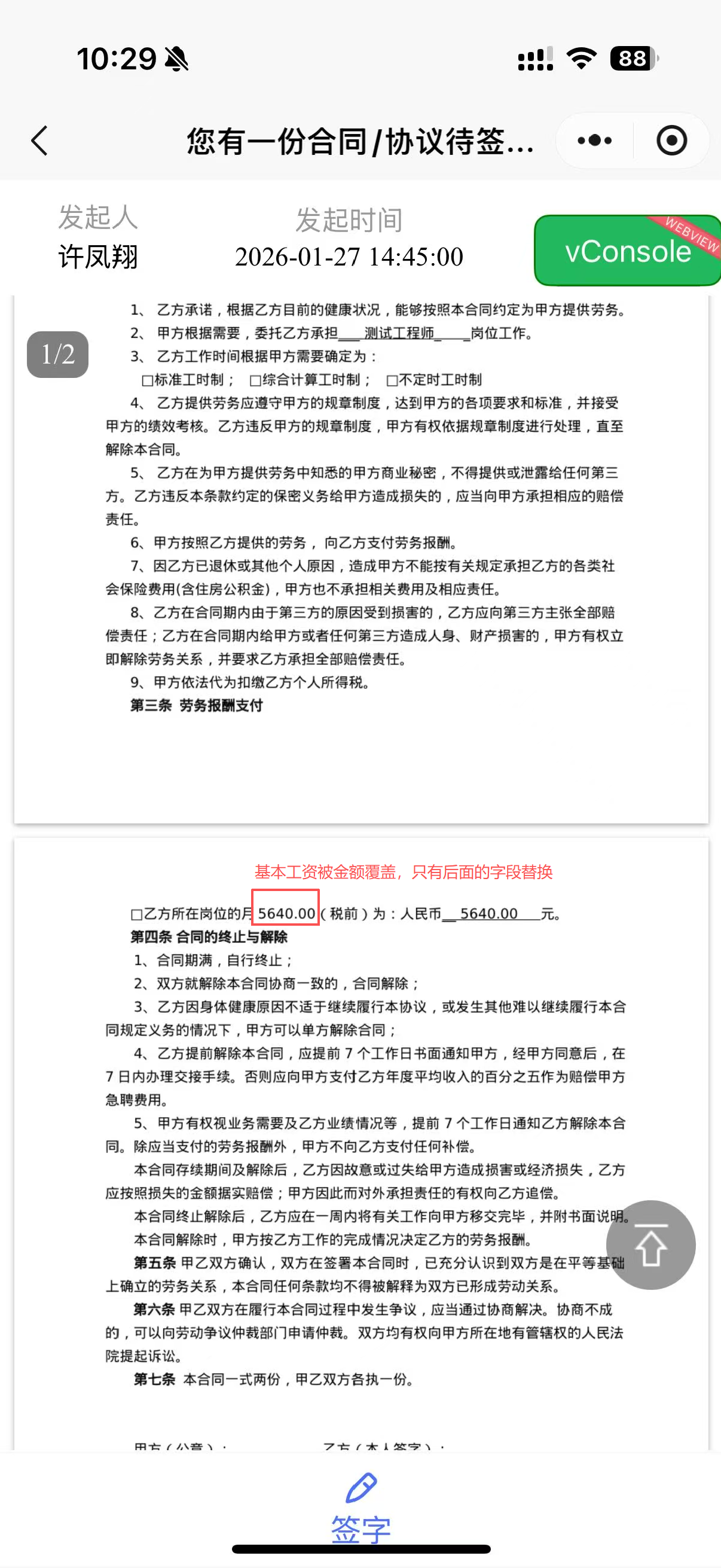 合同签署文件中,文本中的“基本工资”字段被替换成员工工资