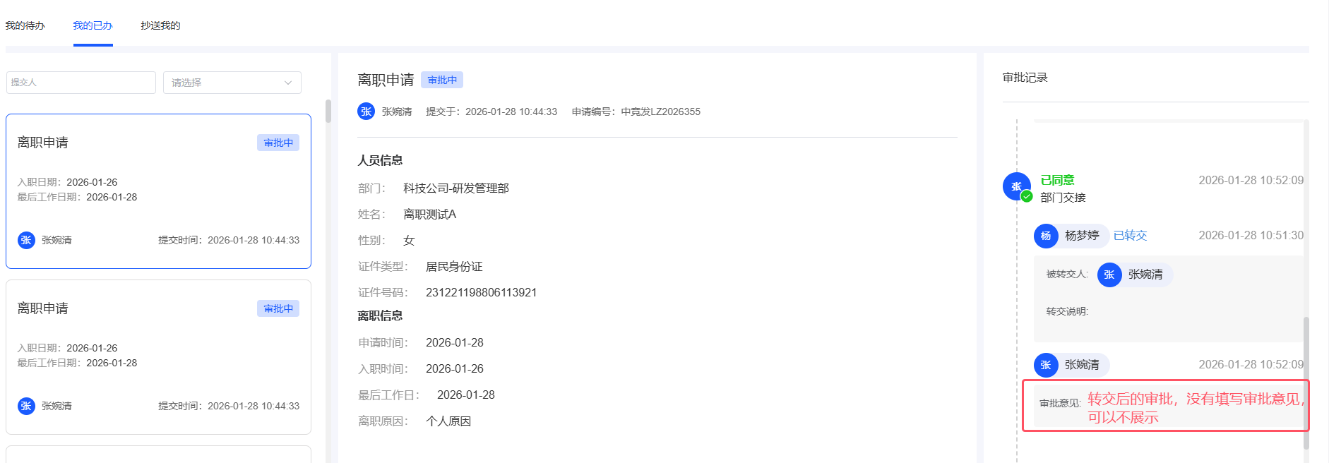 员工自助-我的审批:转交后的审批流程中,审批通过未填写审批意见,可以不展示审批意见部分