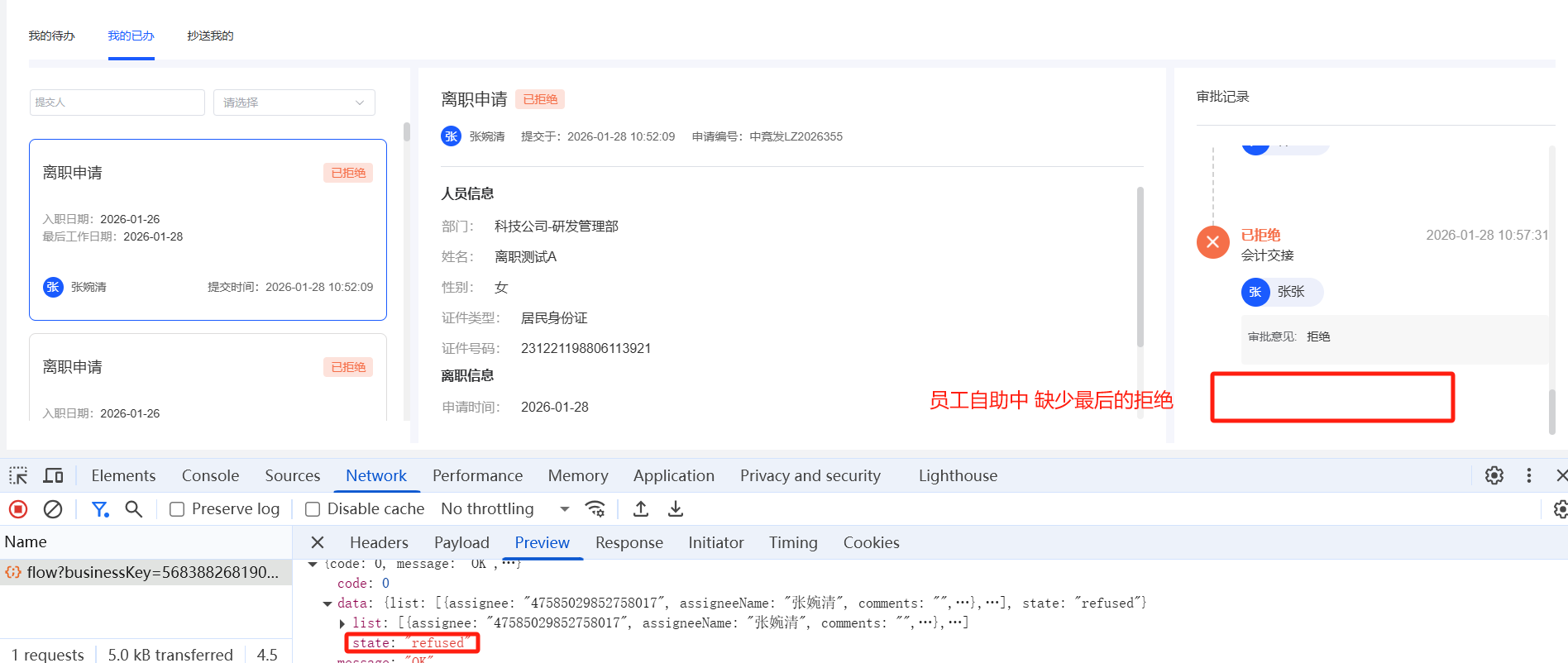 员工自助-我的审批-离职流程:拒绝后,缺少最后的拒绝流程