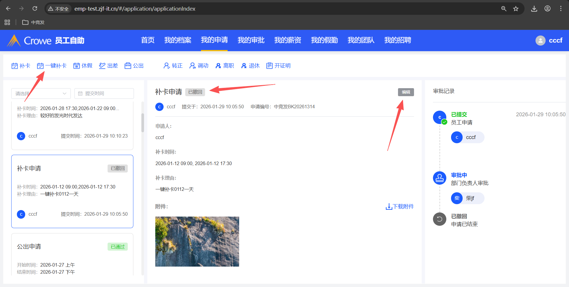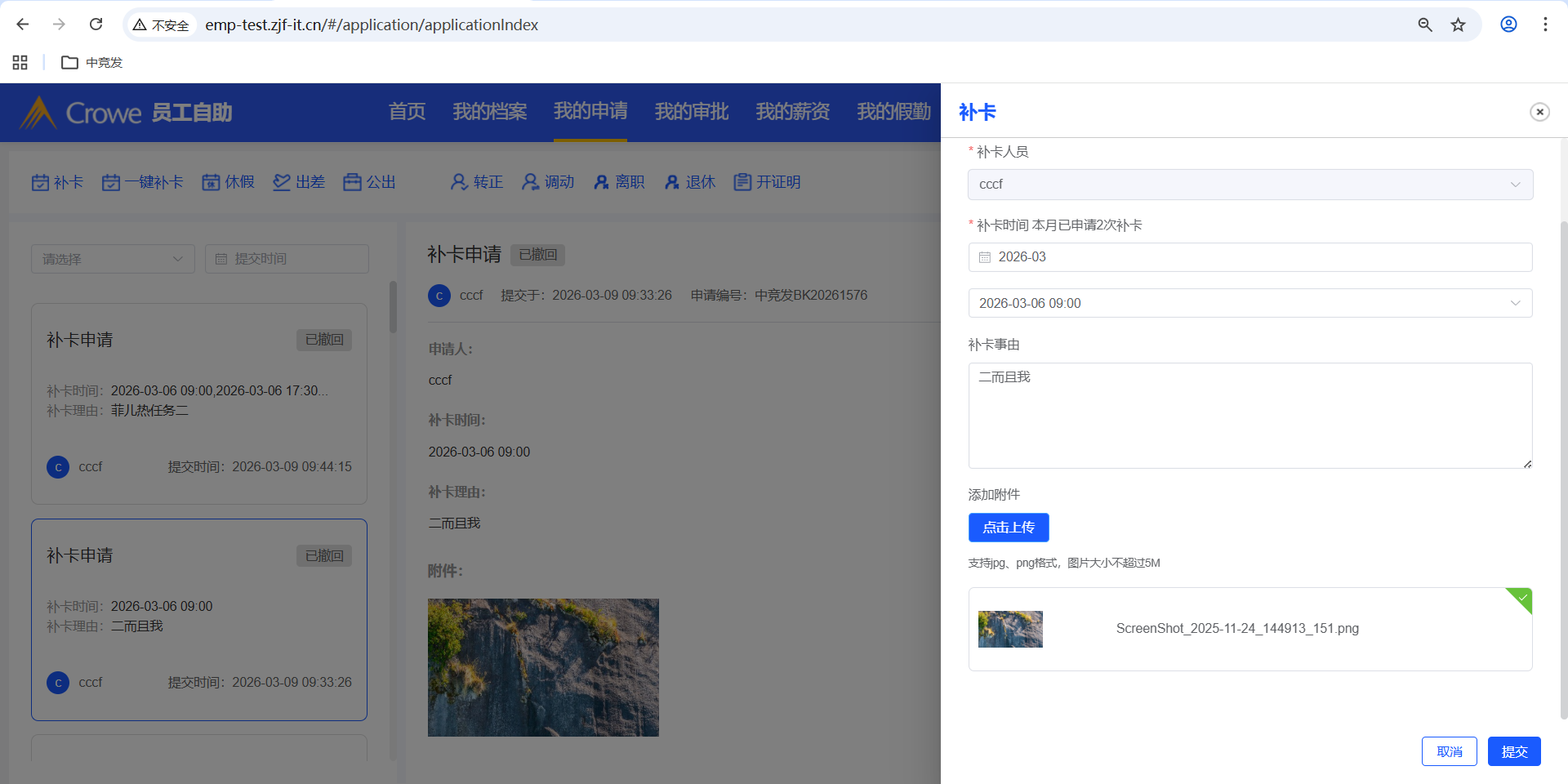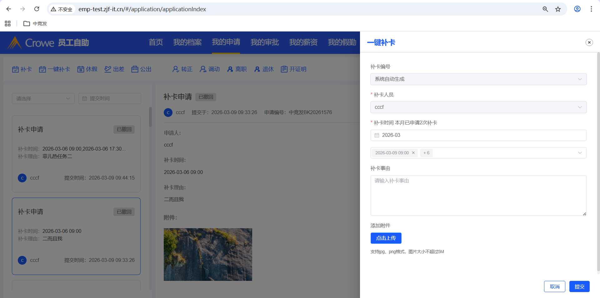 已关闭员工自助-我的申请,一键补卡,撤回后重新编辑,附件需带上