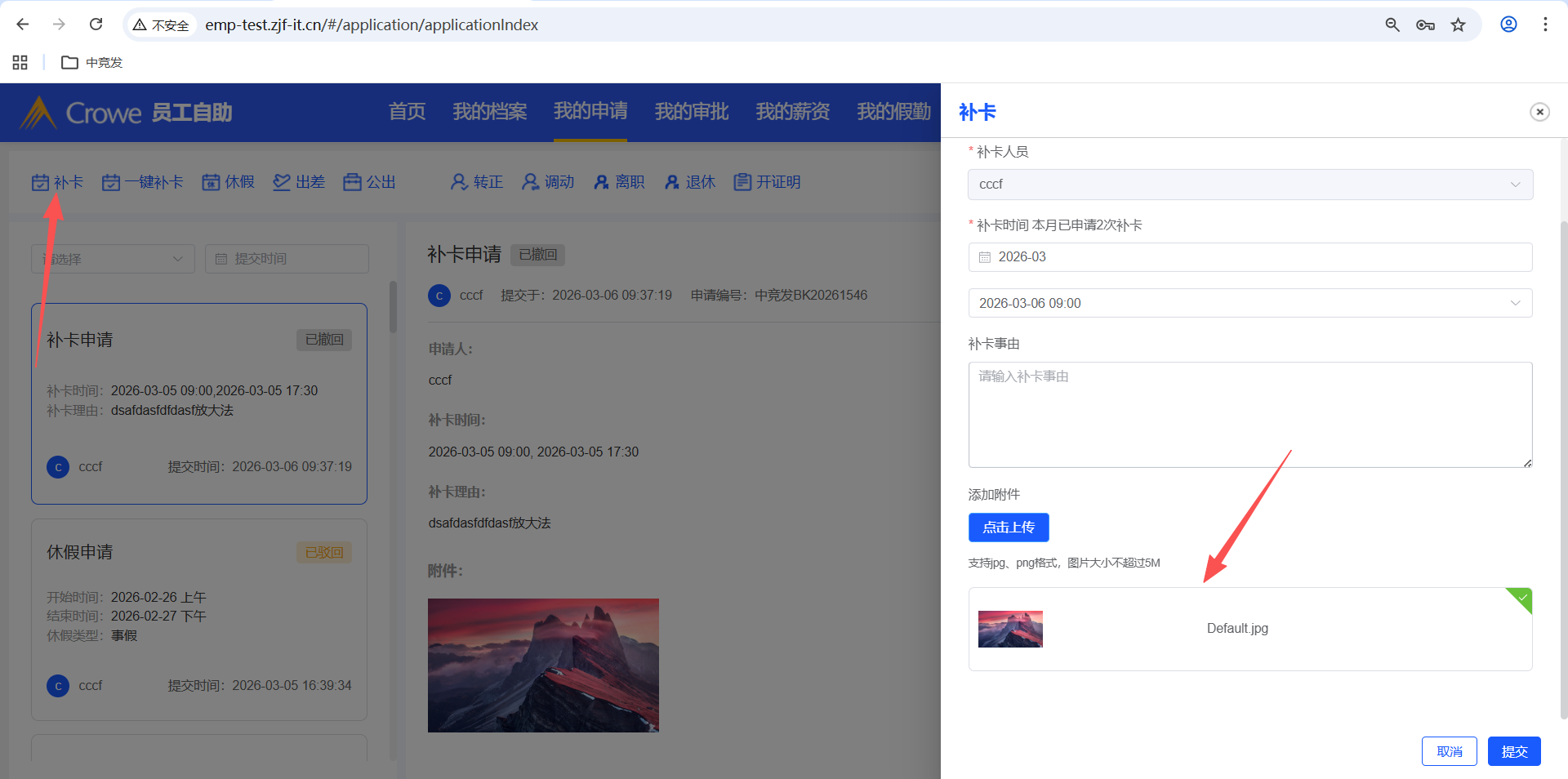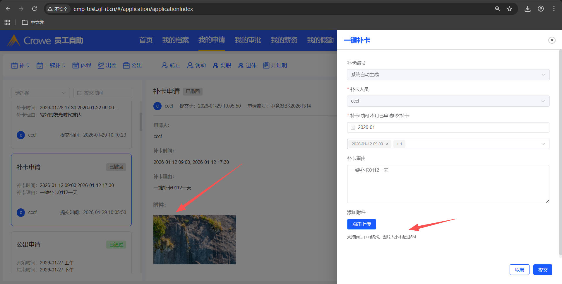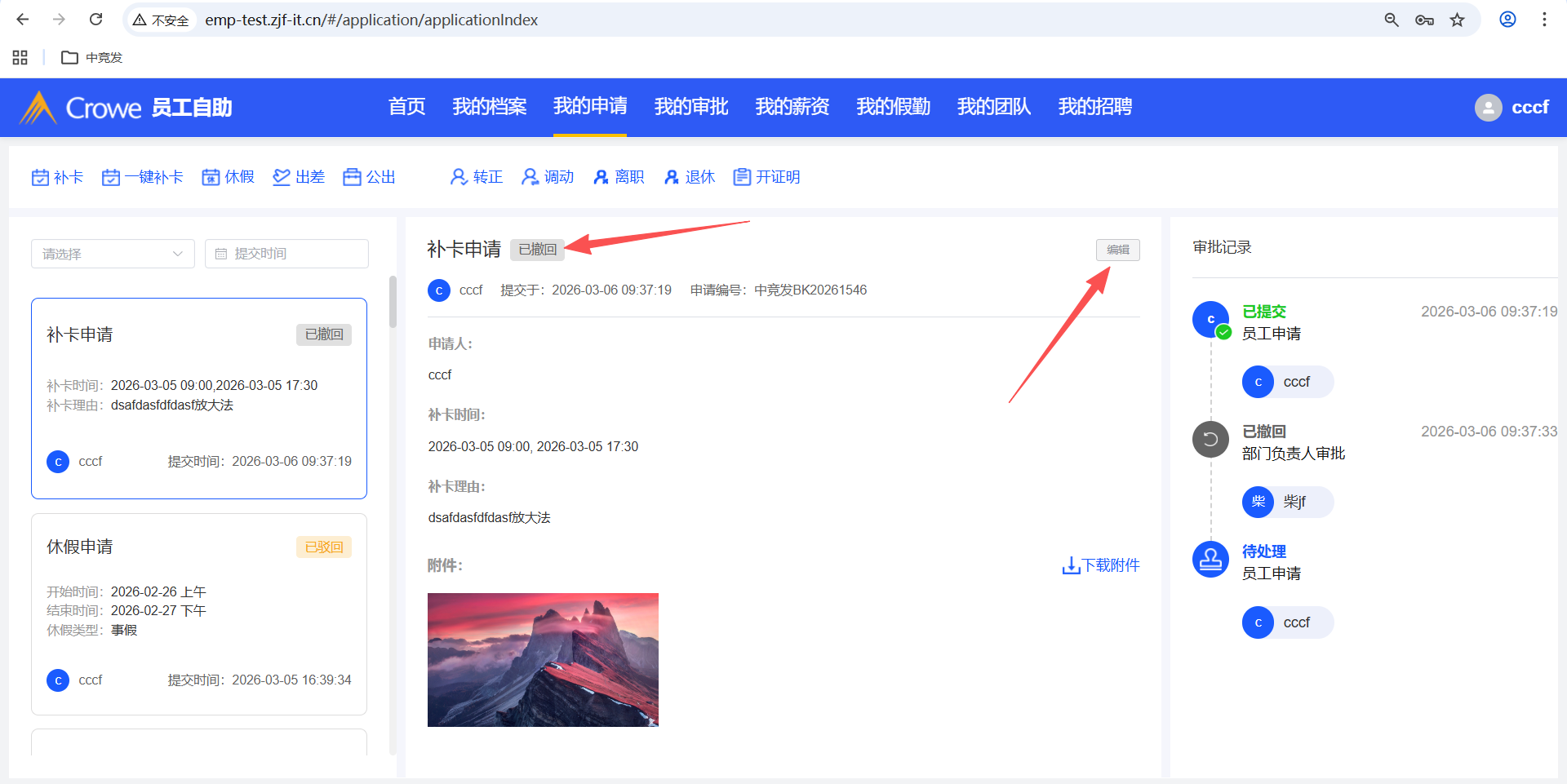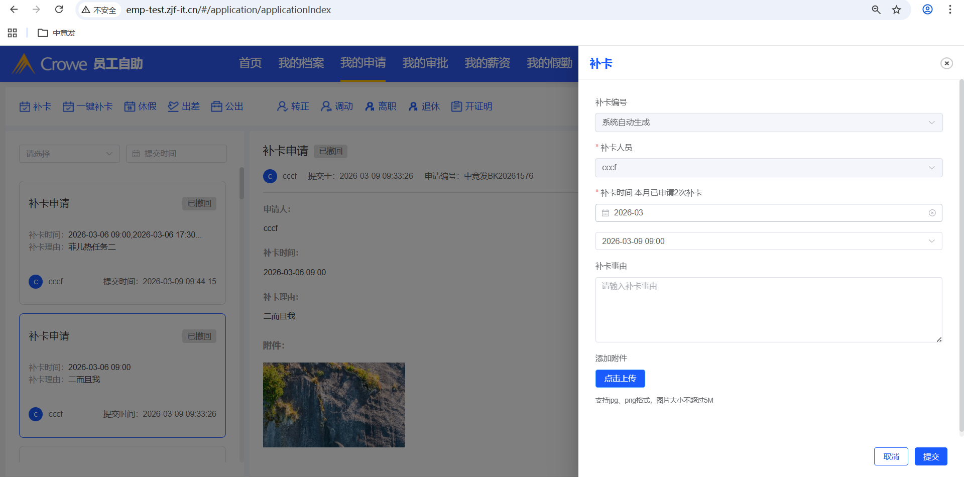 已关闭员工自助-我的申请,一键补卡,撤回后重新编辑,附件需带上