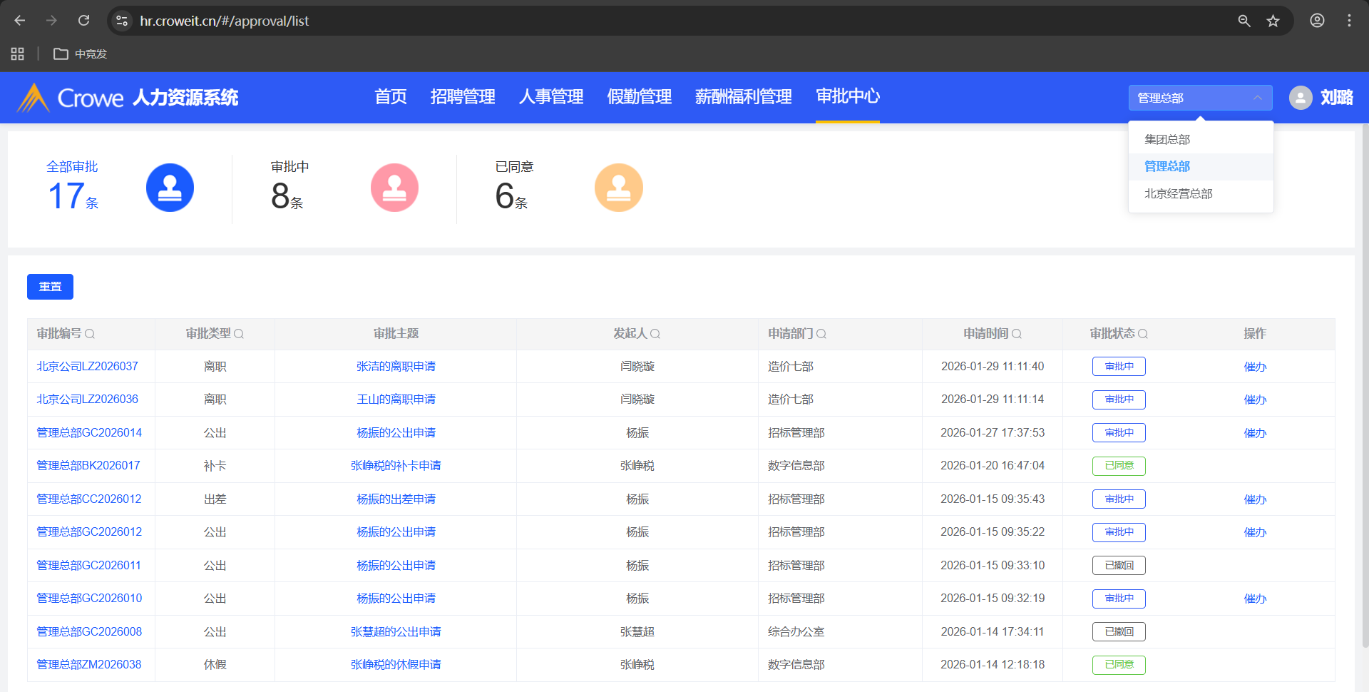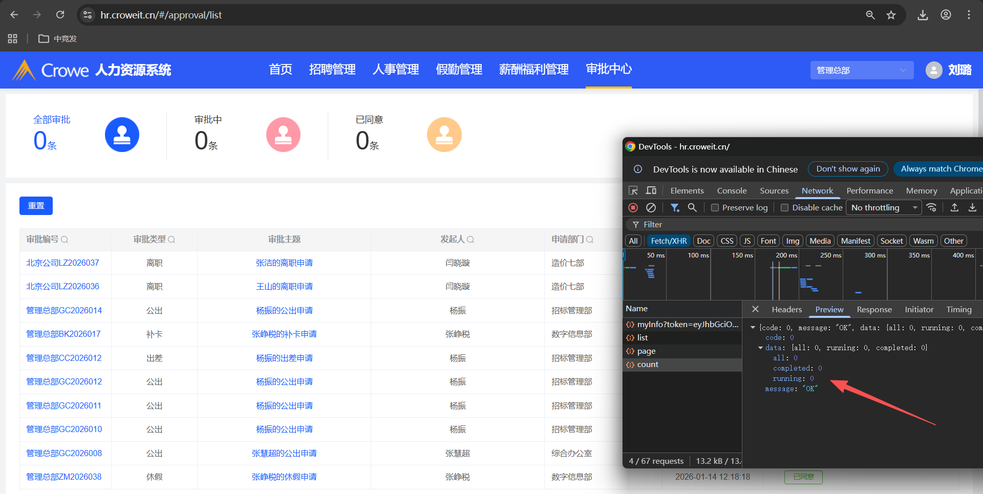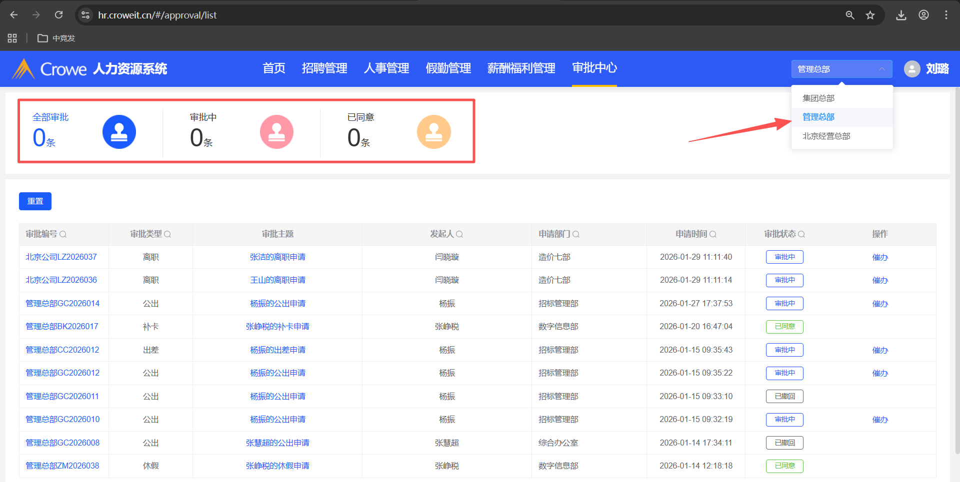 (生产)人力资源系统-审批中心,某用户切换公司后,审批中心全部审批、审批中、已同意都显示0了,实际有值