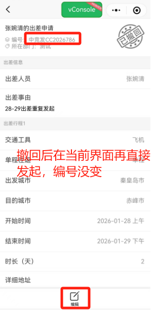 小程序:撤回后的申请在当前界面再直接发起,编号不会变