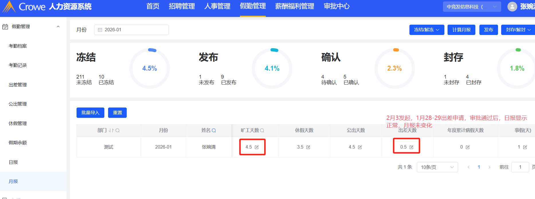 假勤管理-日报/月报:请上个月的假,审核通过后日报同步更新,月报未变化