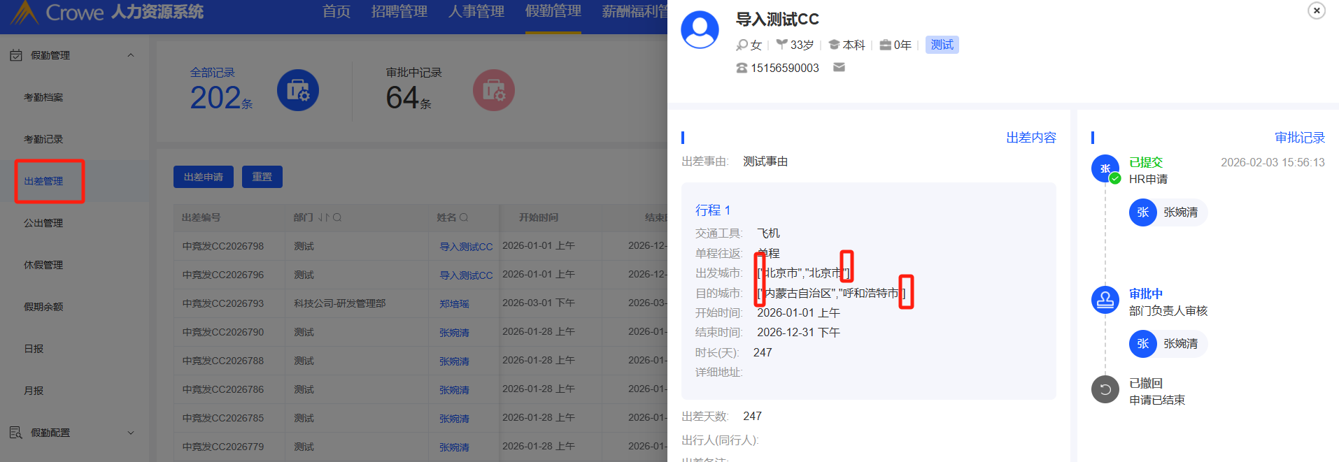 假勤管理-出差管理:发起的出差申请,点击姓名查看详情,出发城市和目的城市样式修改