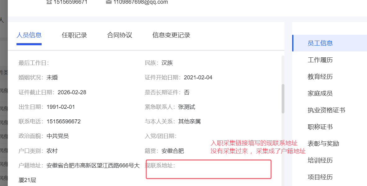人事管理:从入职采集链接中采集的信息,现联系地址采集错误