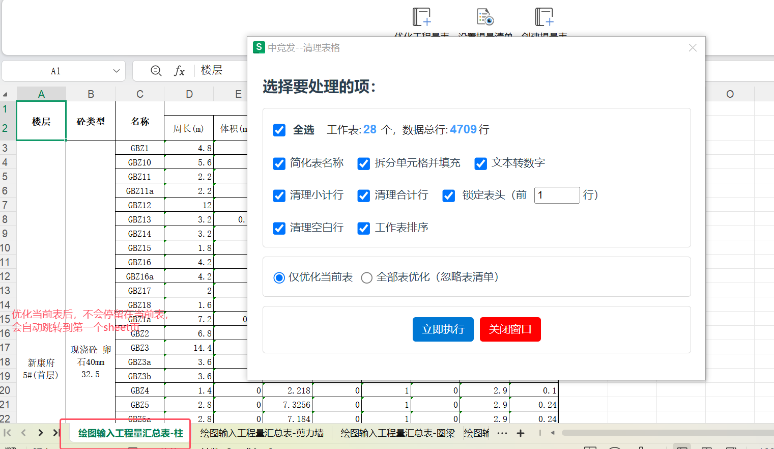 提量工具-优化工程量表:仅优化当前表后,未停留在当前sheet页,默认跳转到第一个sheet页