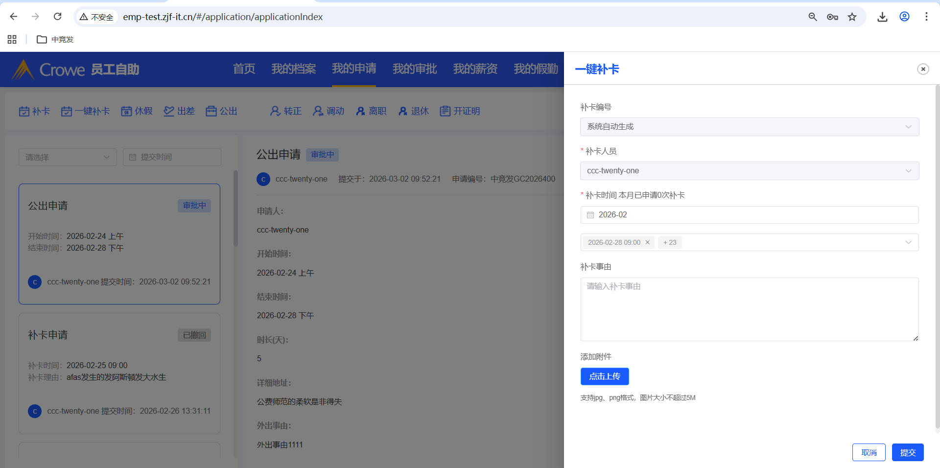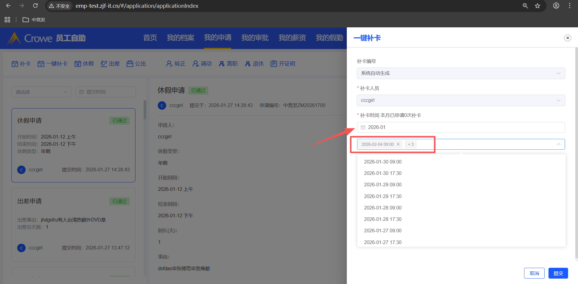 已关闭员工自助-我的申请,一键补卡的补卡时间切换月份(往前切换月份)后,下面的时间显示的还是未切换月份的时间