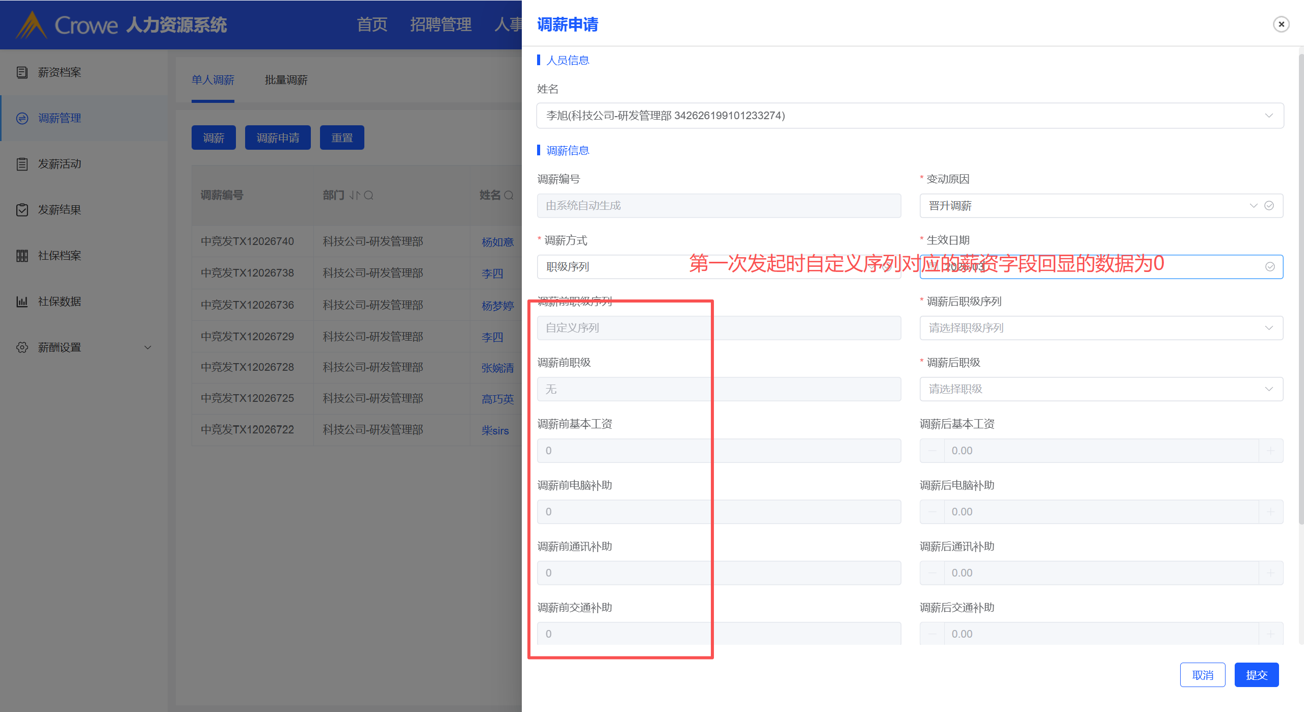 2、打开编辑页面,自定义序列的薪酬字段变为“请输入”,与刚发起时不一致