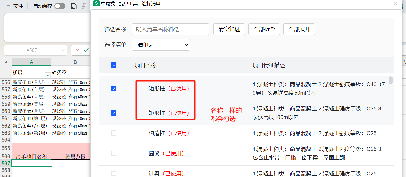 提量工具-创建提量表:双击清单项目名称,弹出的选择框中,项目名称一样的勾选一个全部的都会被勾选