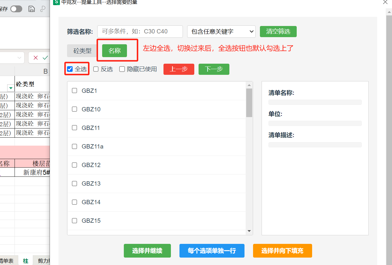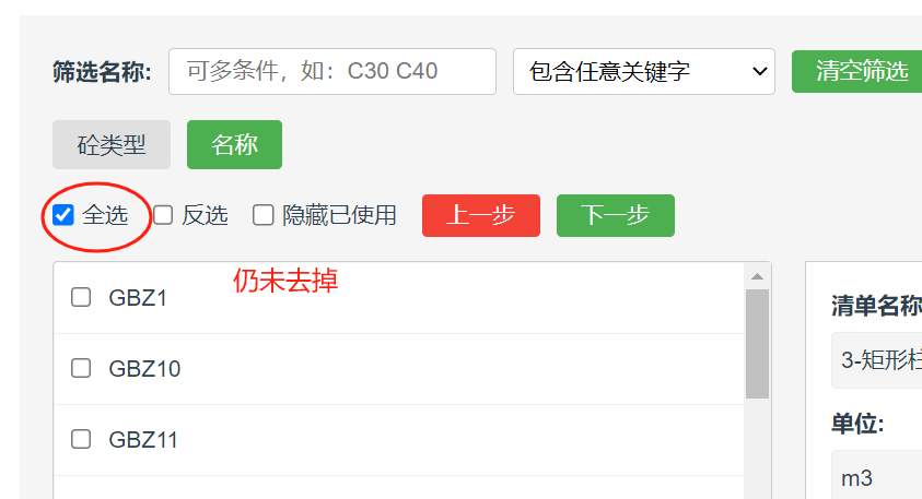 提量工具-创建提量表:选择构件/材料弹框中,左侧的全选,切换到右侧,默认也带上了全选