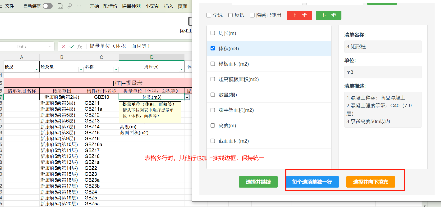 提量工具-创建提量表:表格多行时,建议其他行也加上实线边框保持统一