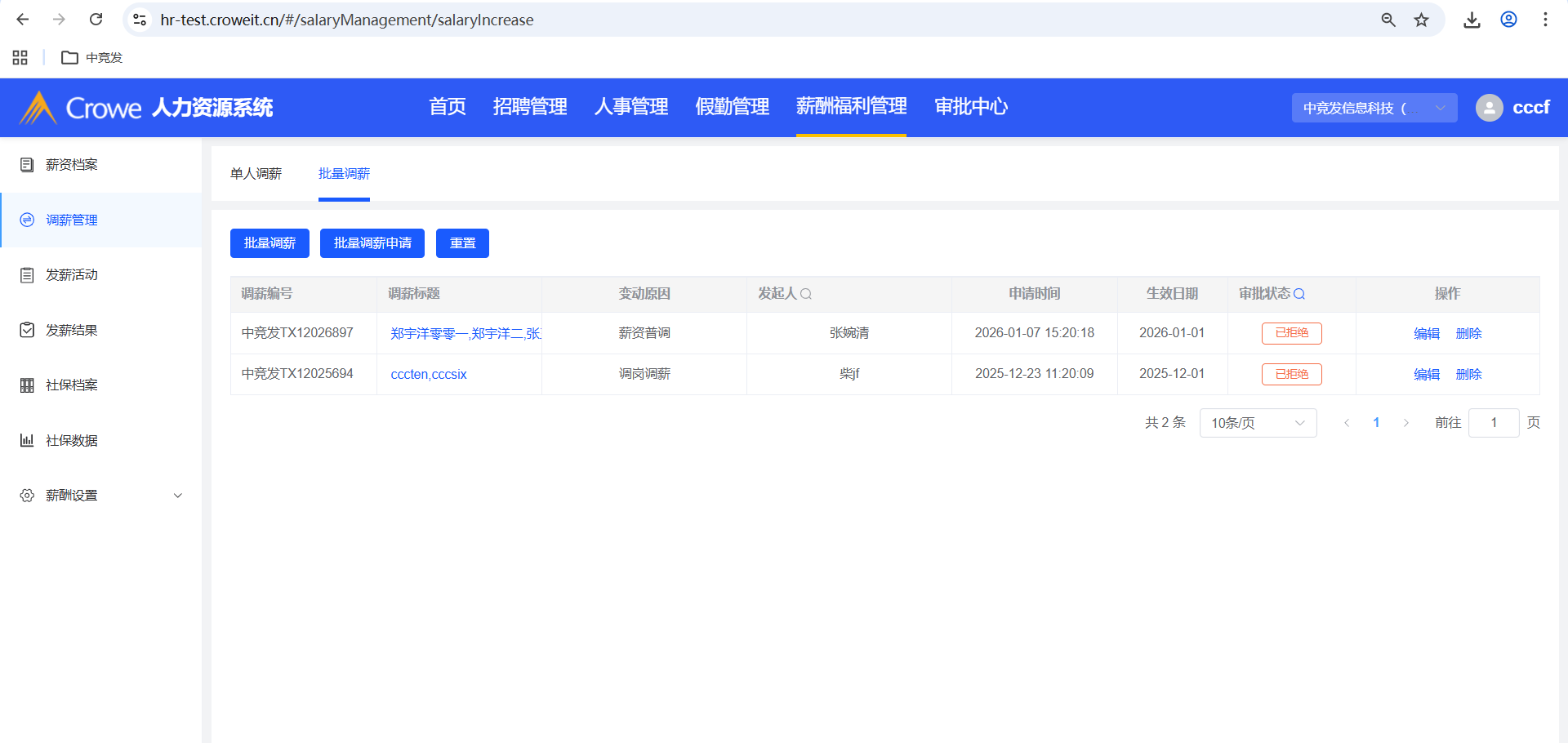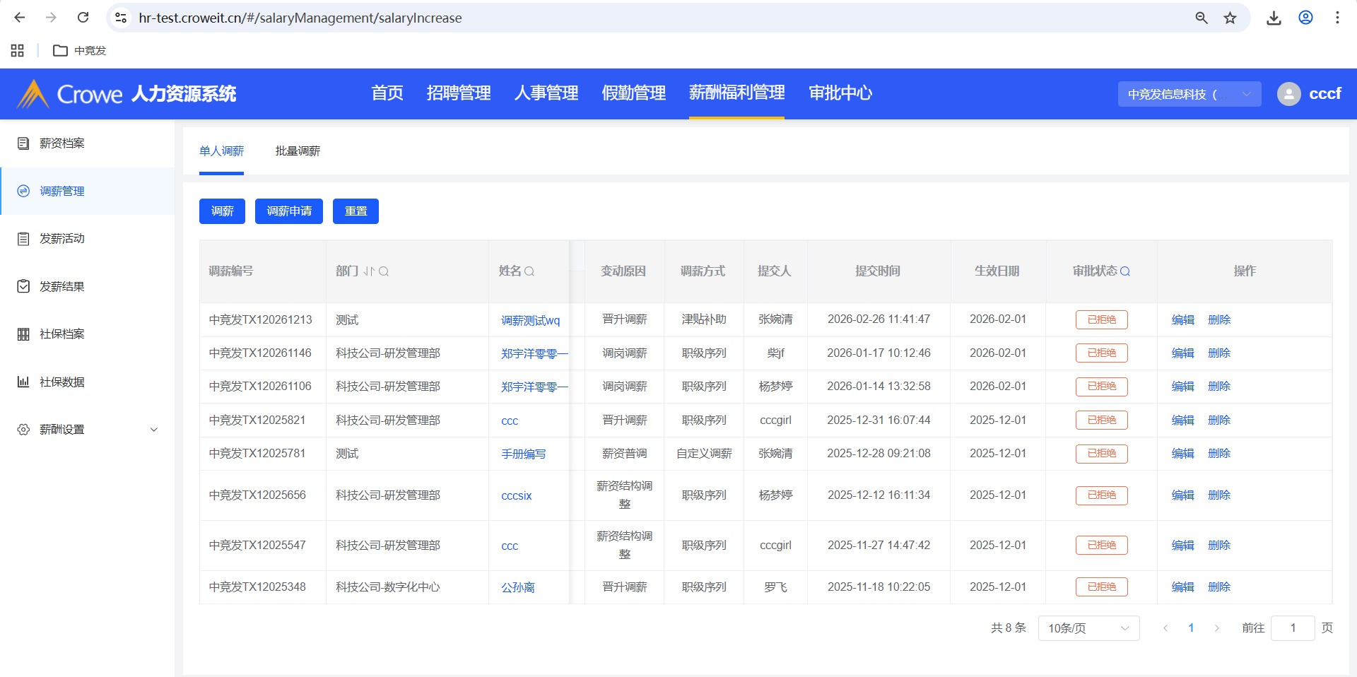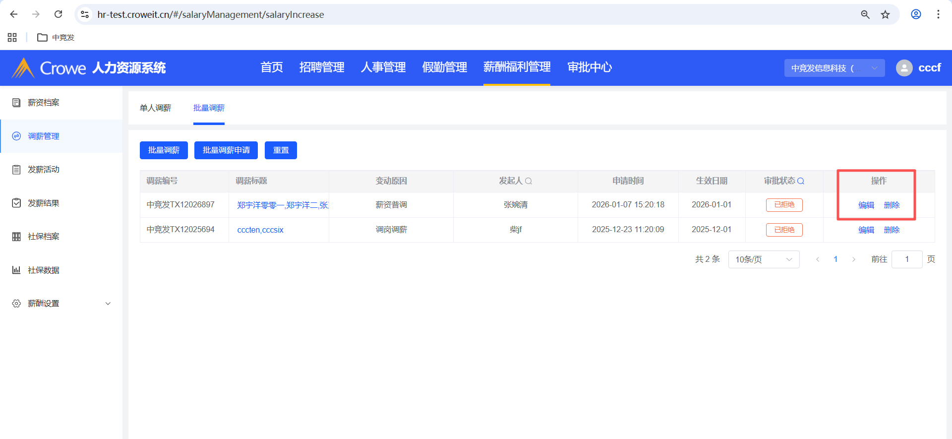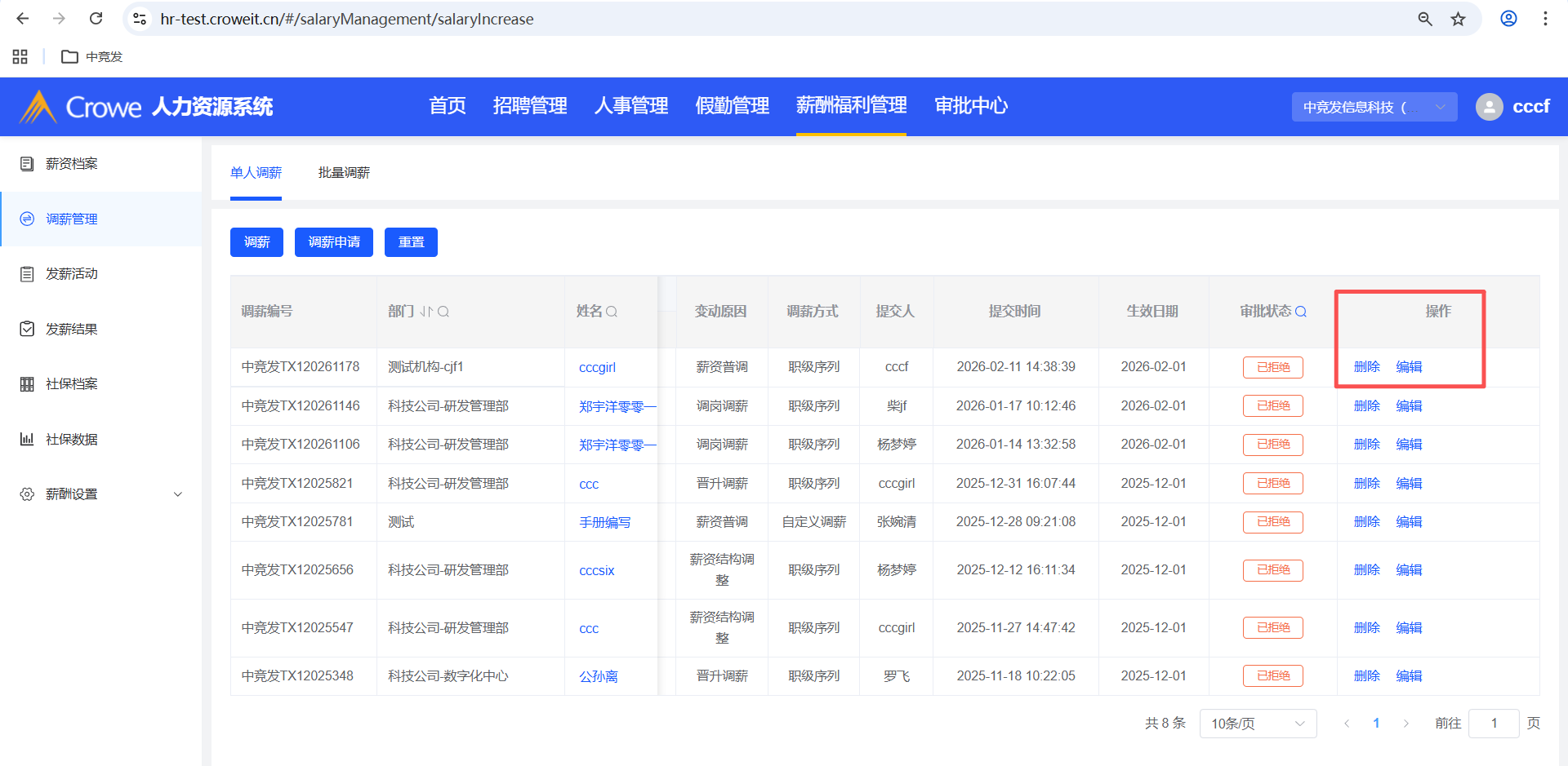人力资源系统-薪酬福利管理-调薪管理-单人调薪,已拒绝的操作栏,编辑按钮在删除按钮前面