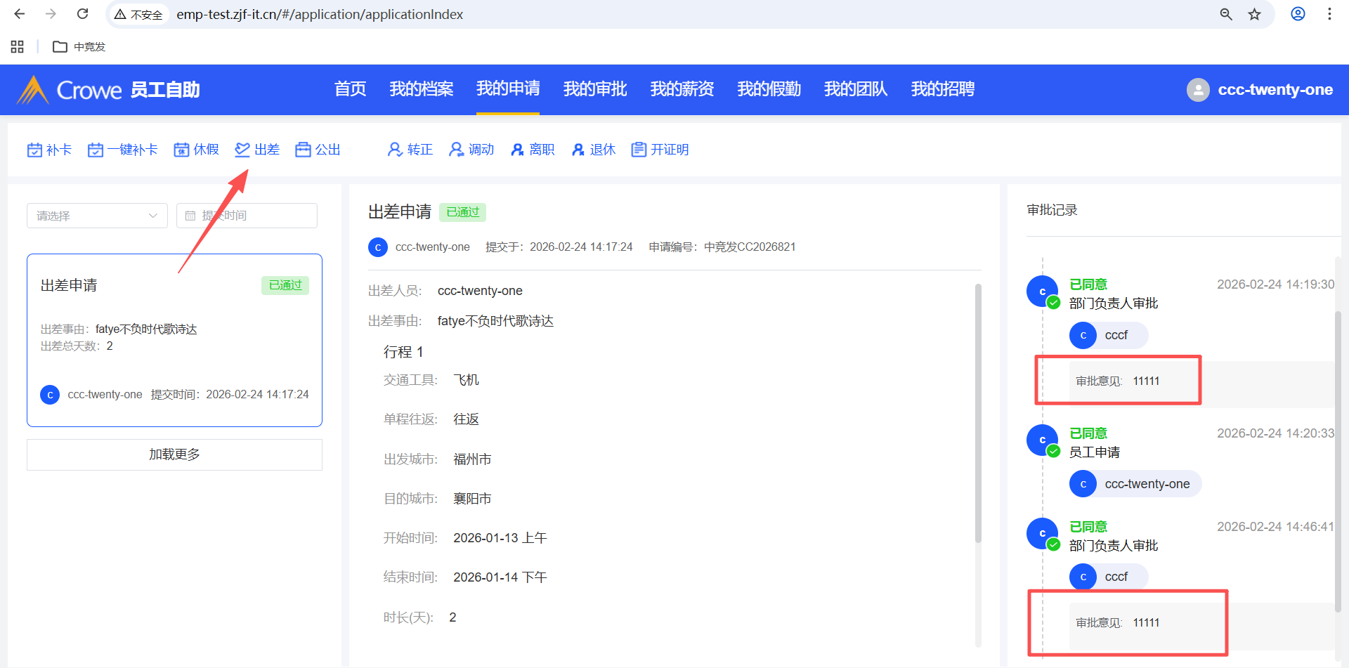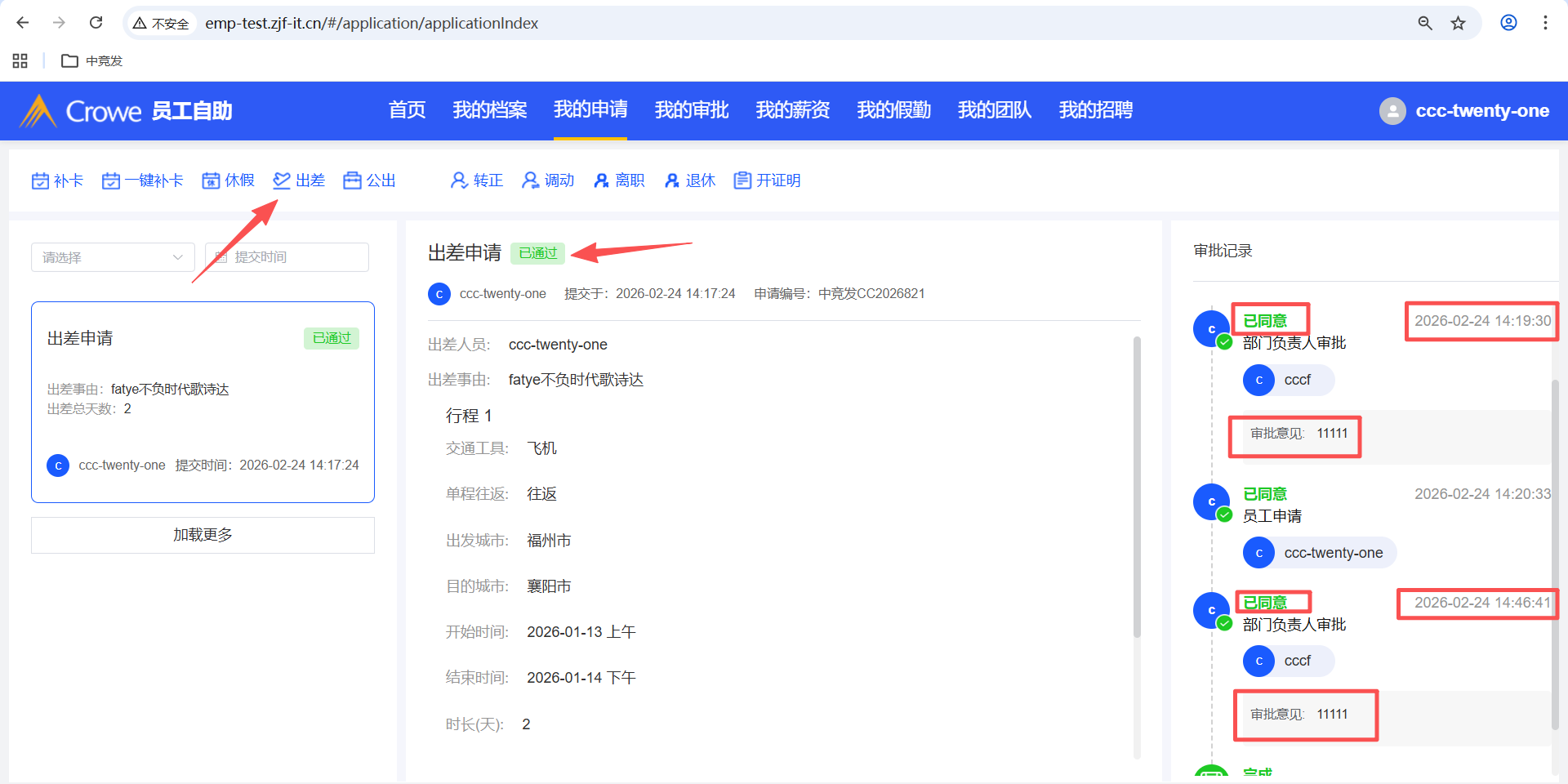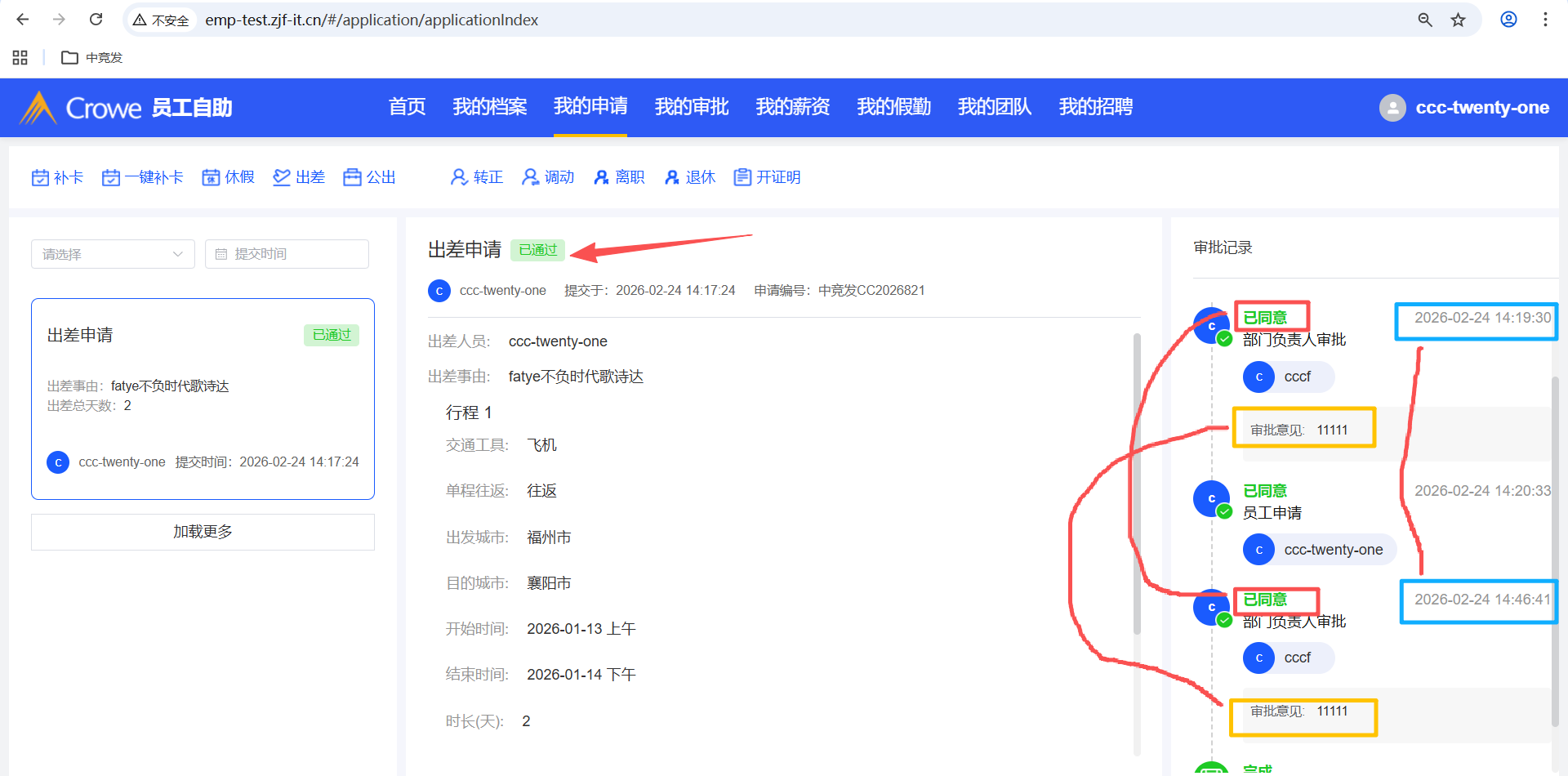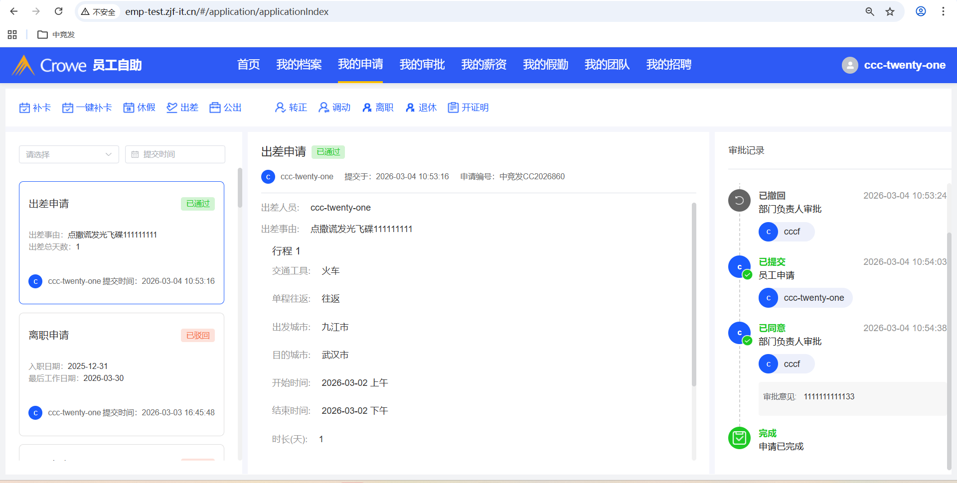 员工自助-我的申请,出差申请撤回后编辑,重新提交,部门负责人审批通过后,审批记录出现了2次审批意见、已同意、同意时间,预期:只需要显示1次