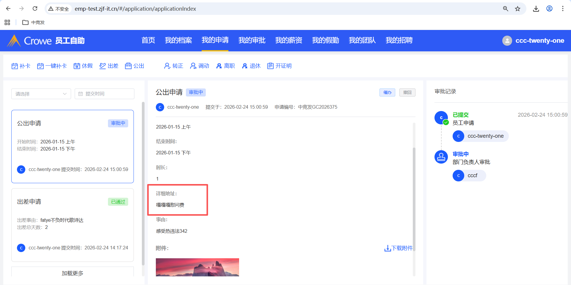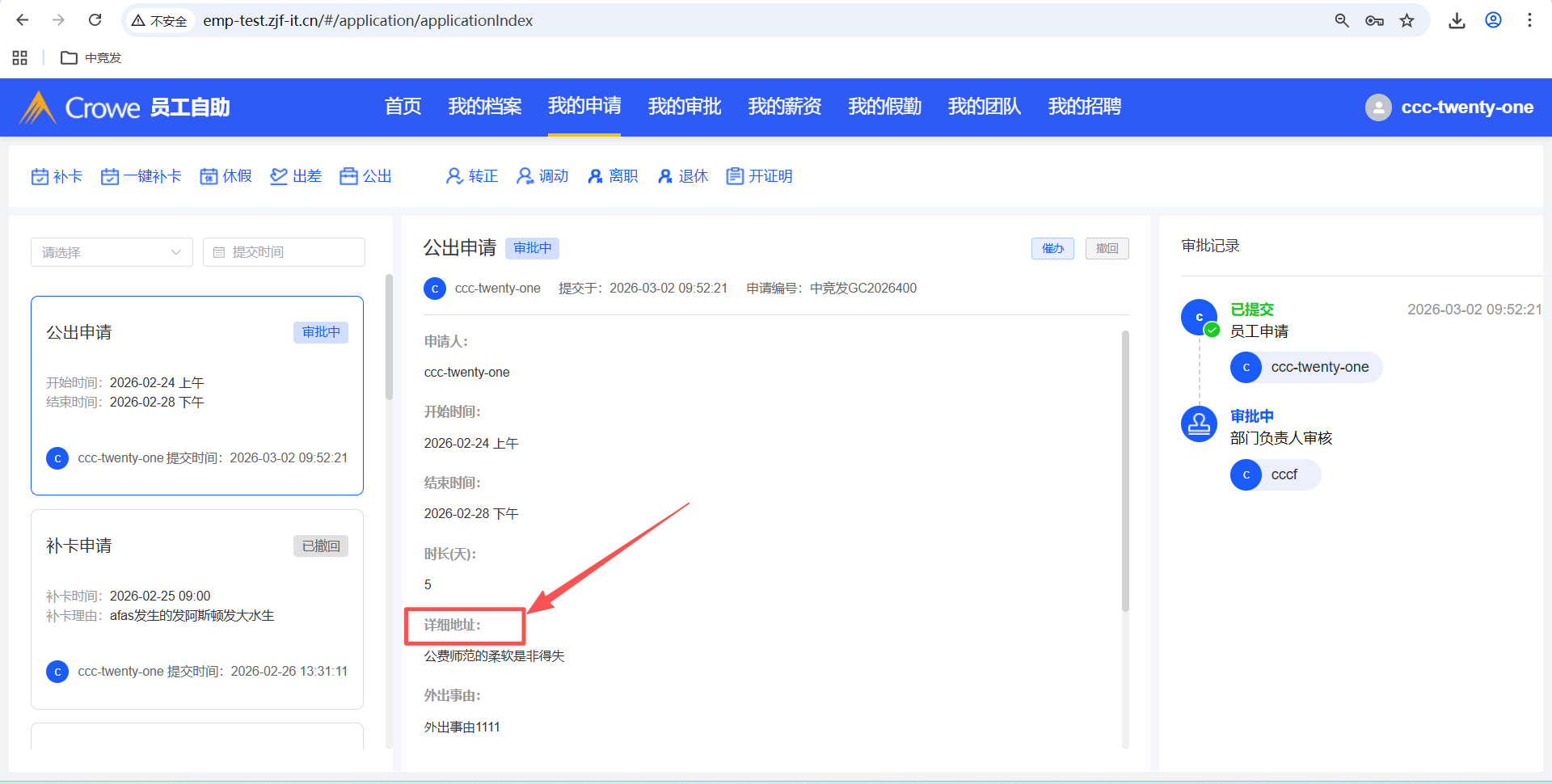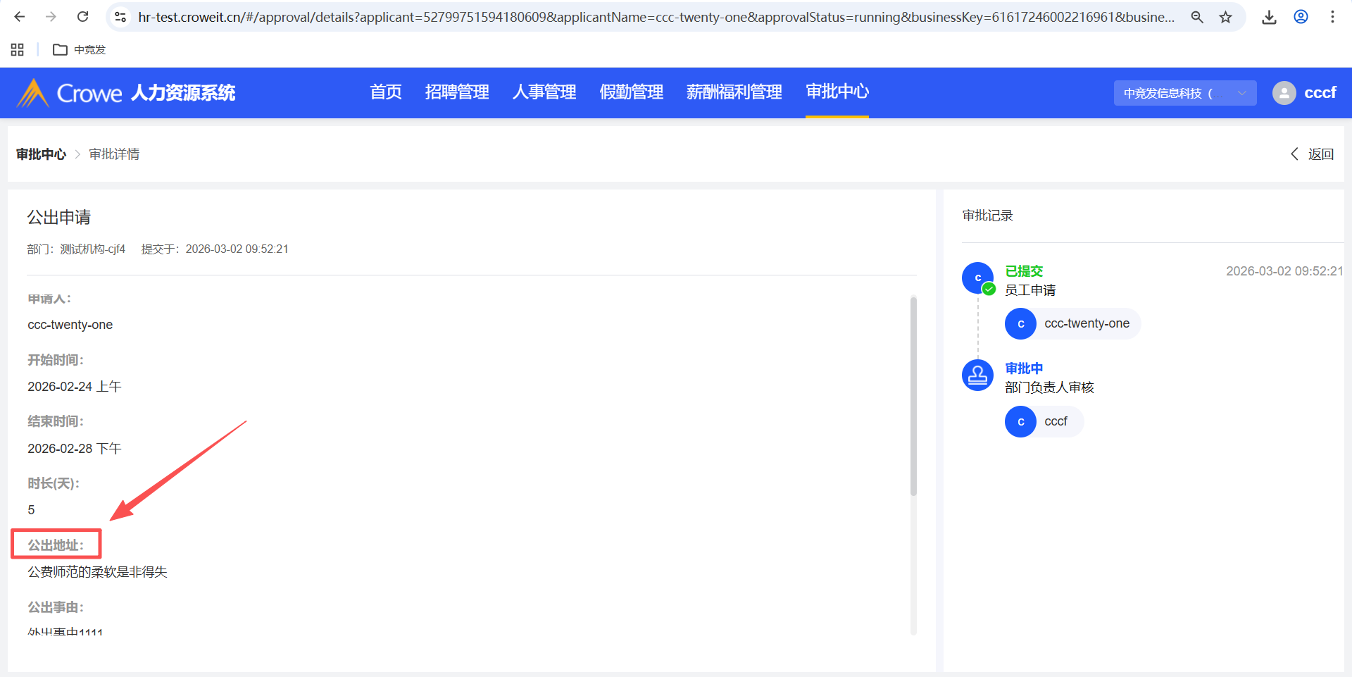 已关闭员工自助-我的申请-公出申请填写了详细地址,人力资源系统-审批中心的详情 未显示详细地址