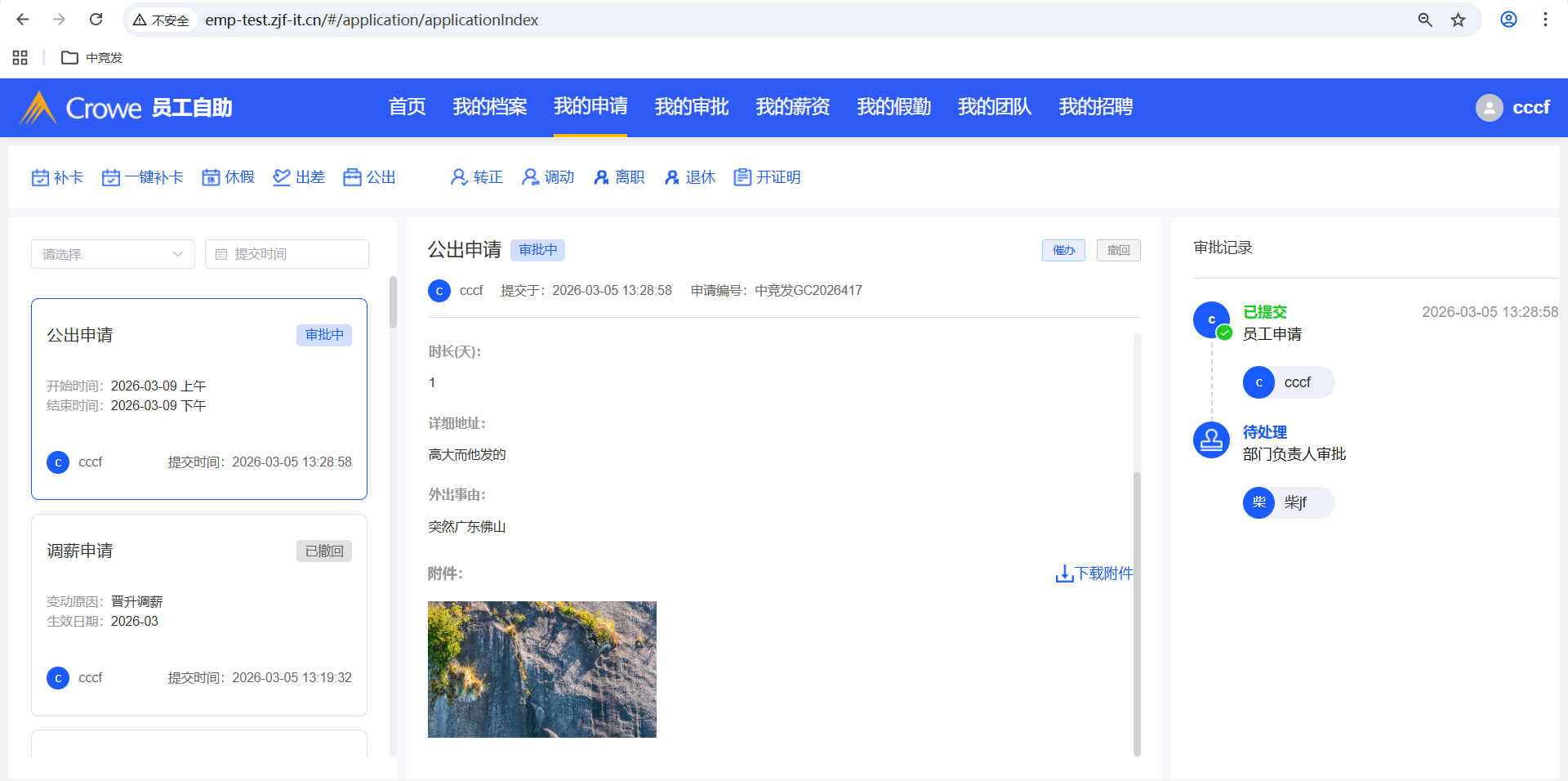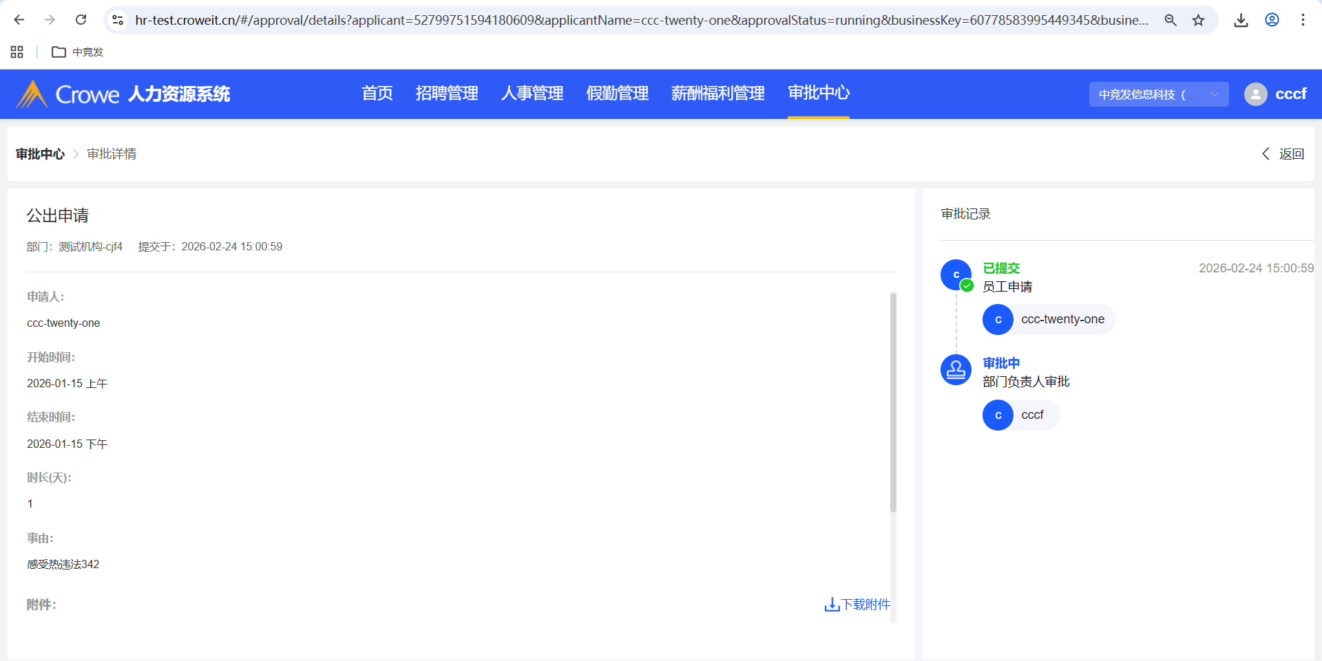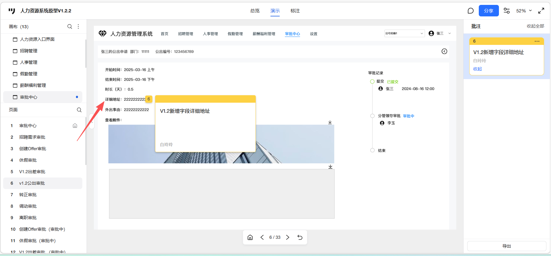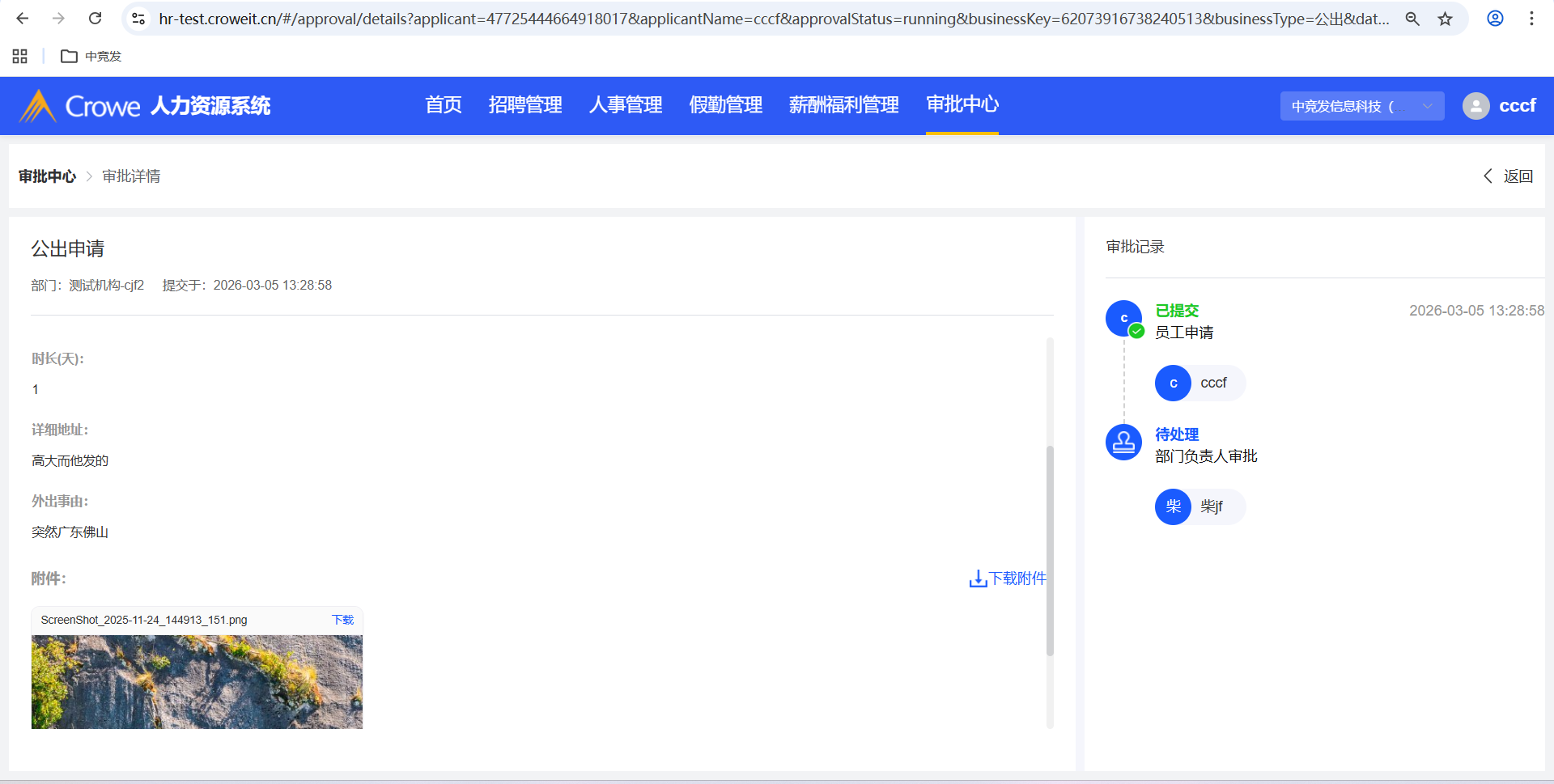 已关闭员工自助-我的申请-公出申请填写了详细地址,人力资源系统-审批中心的详情 未显示详细地址