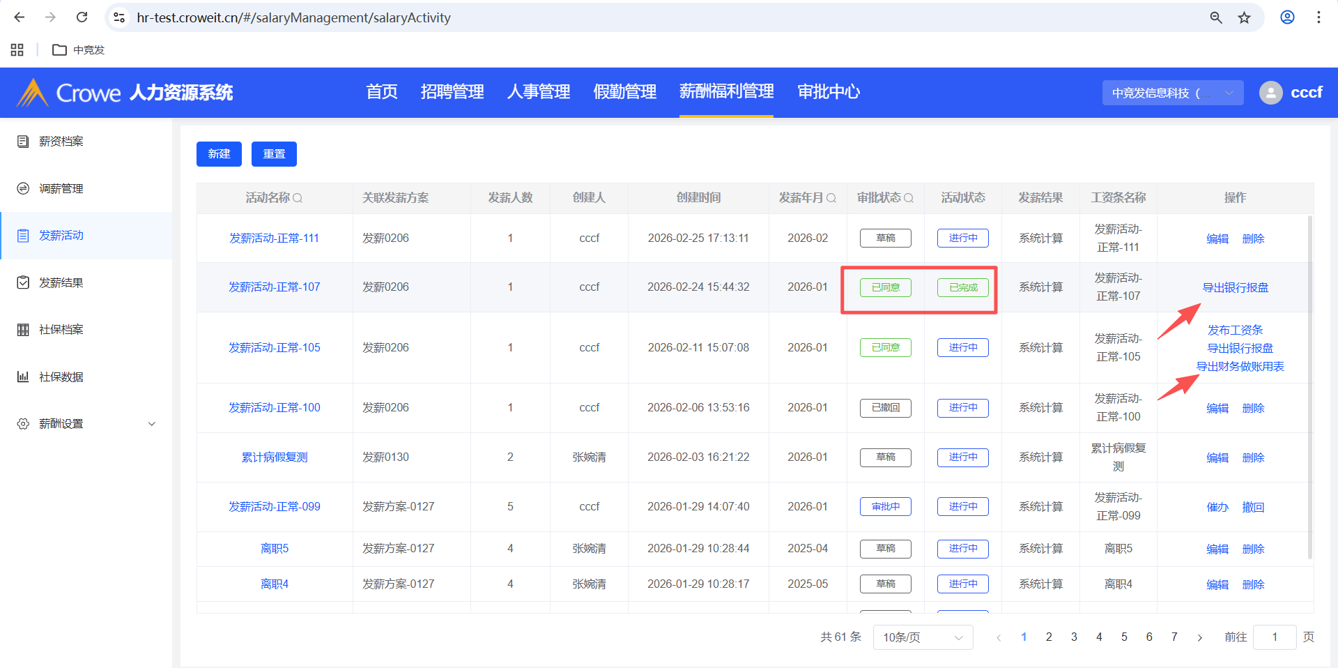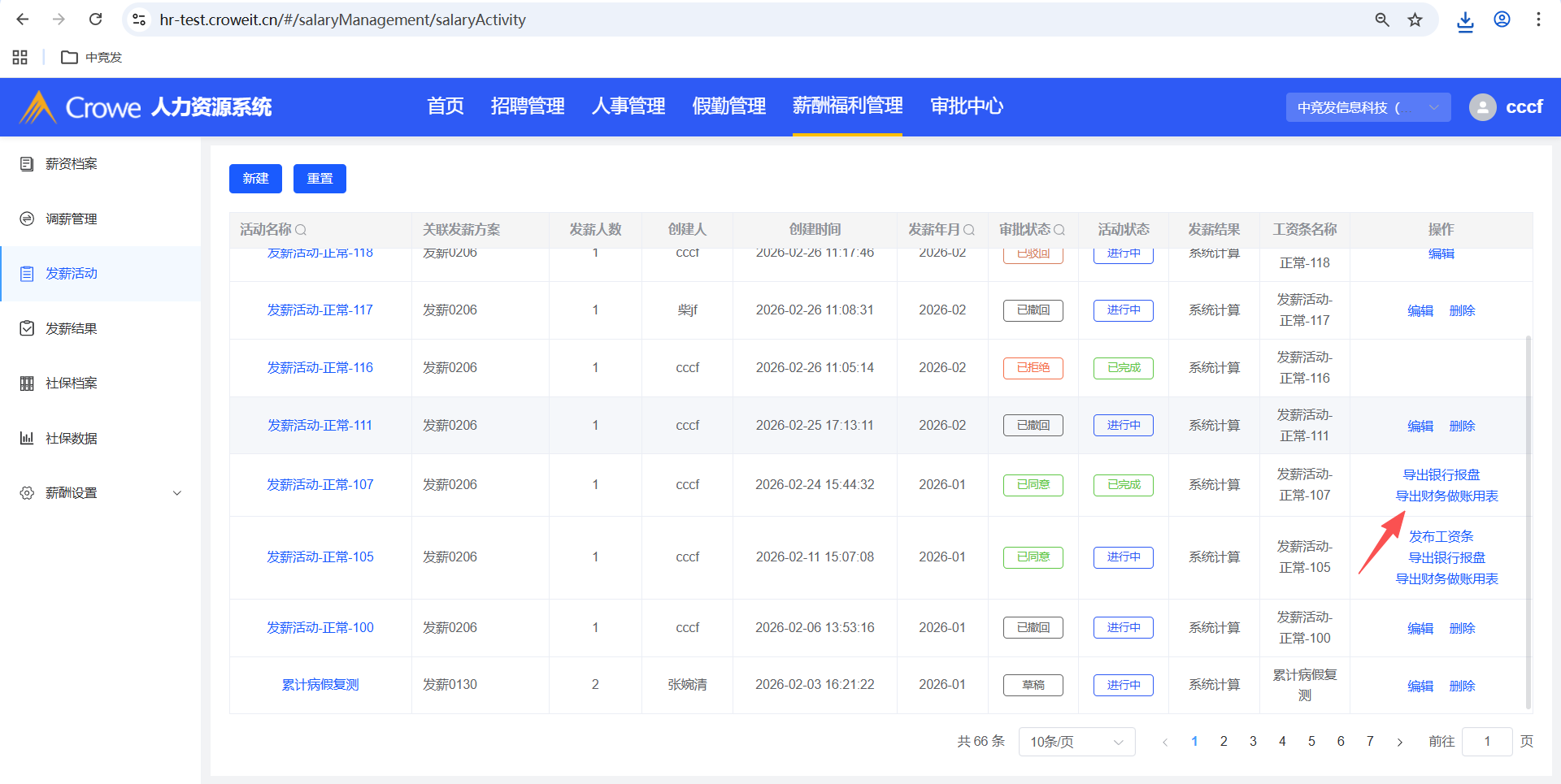 人力资源系统-薪酬福利管理-发薪活动,活动状态为已完成,操作栏建议显示:导出财务做账用表。同:导出银行报盘