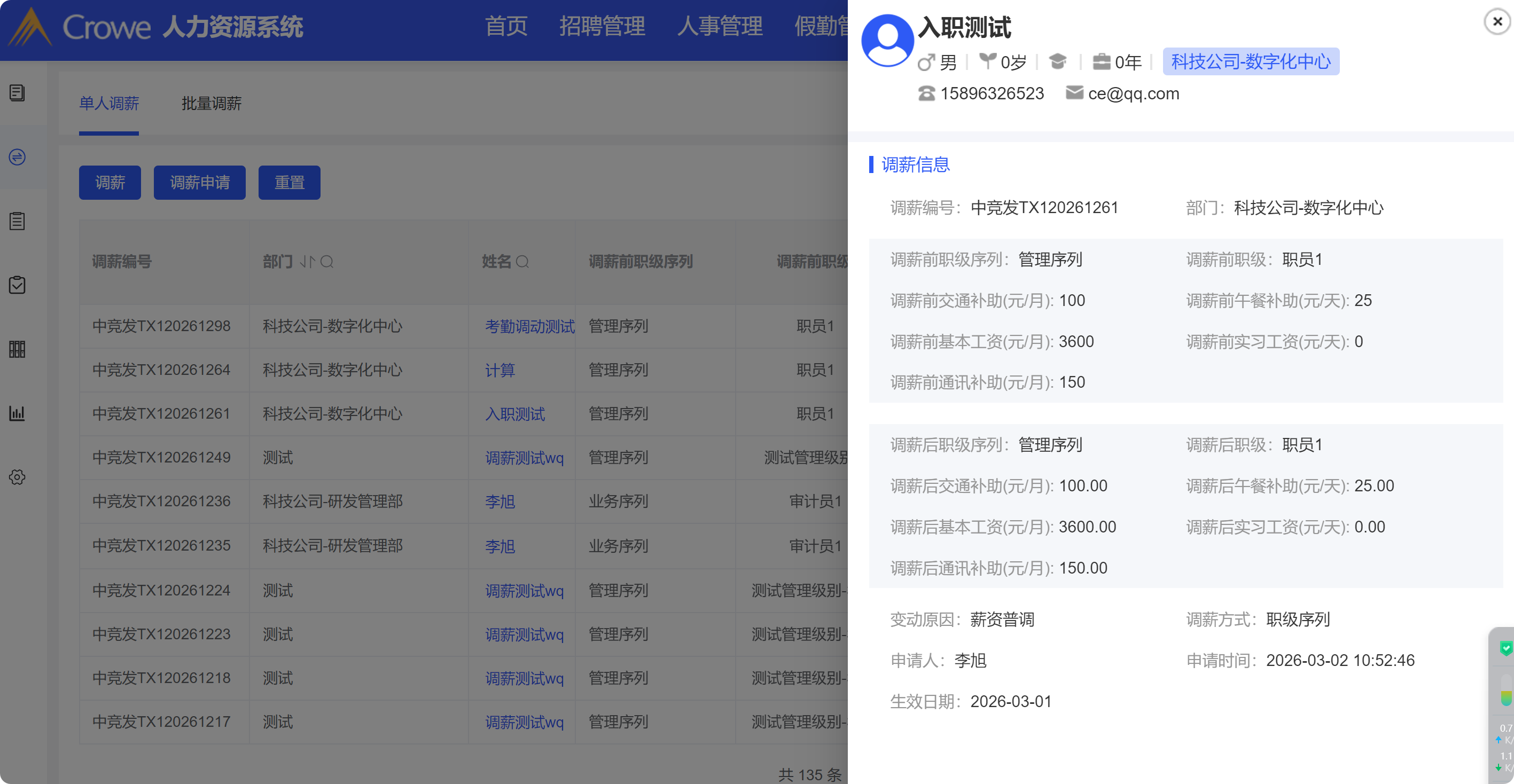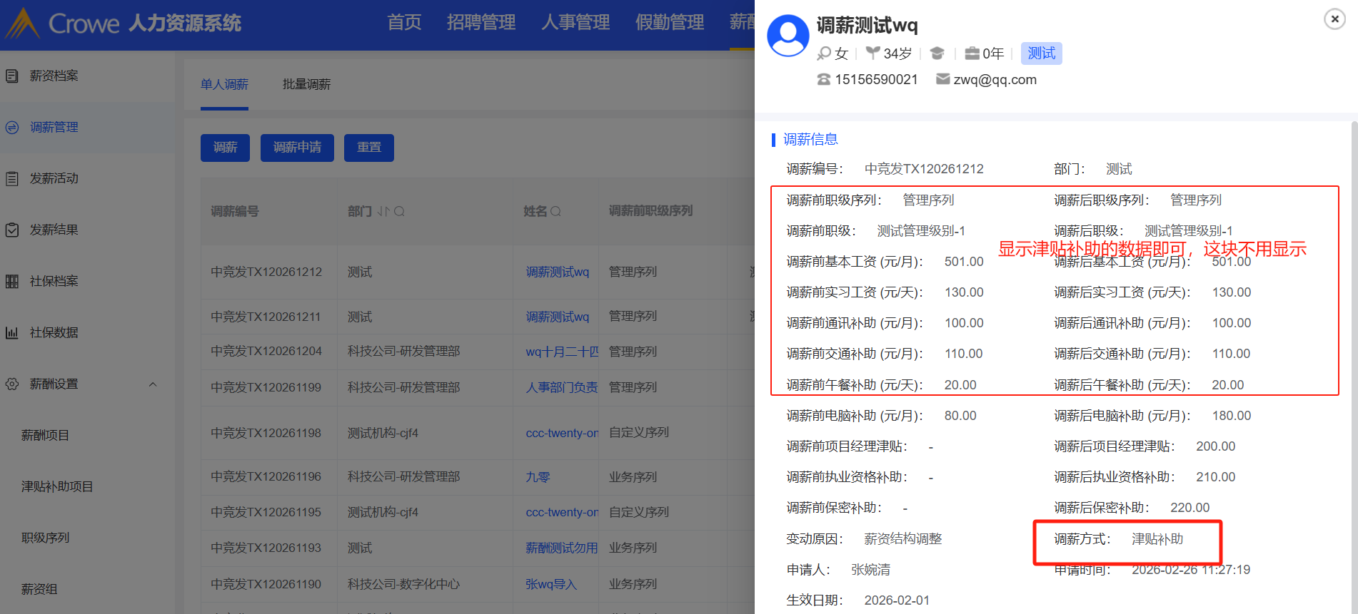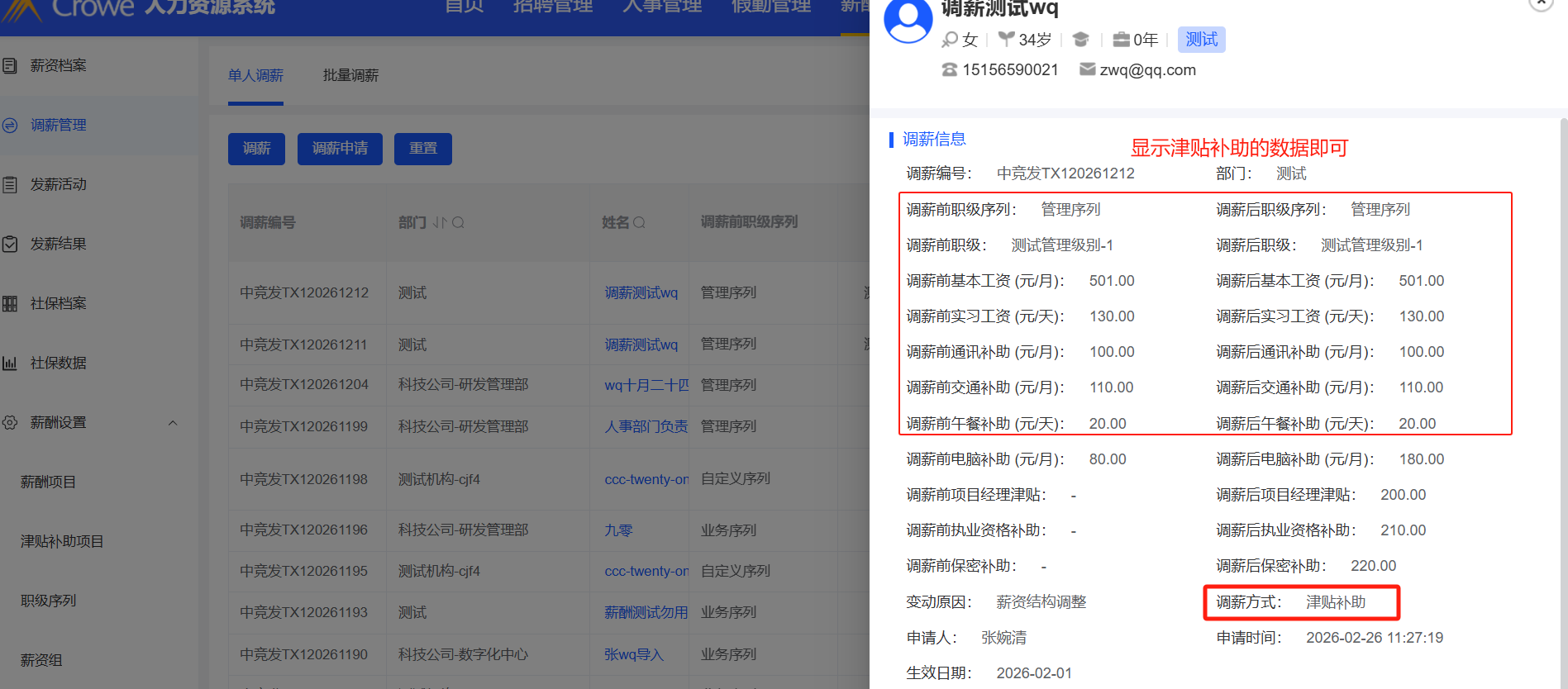 薪酬福利管理-调薪管理-单人调薪:津贴调薪,调薪后点击姓名查看调薪详情,只显示津贴补助的数据即可