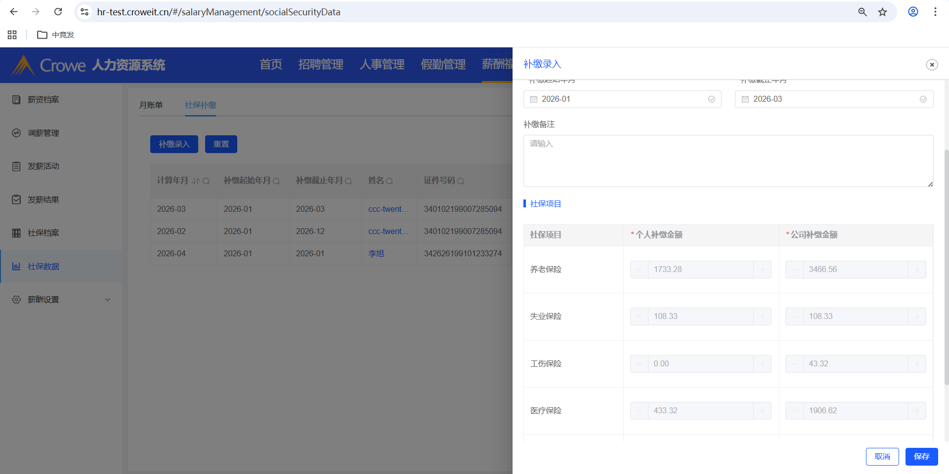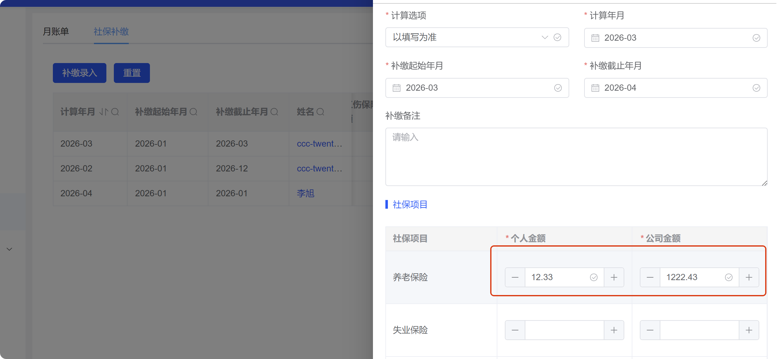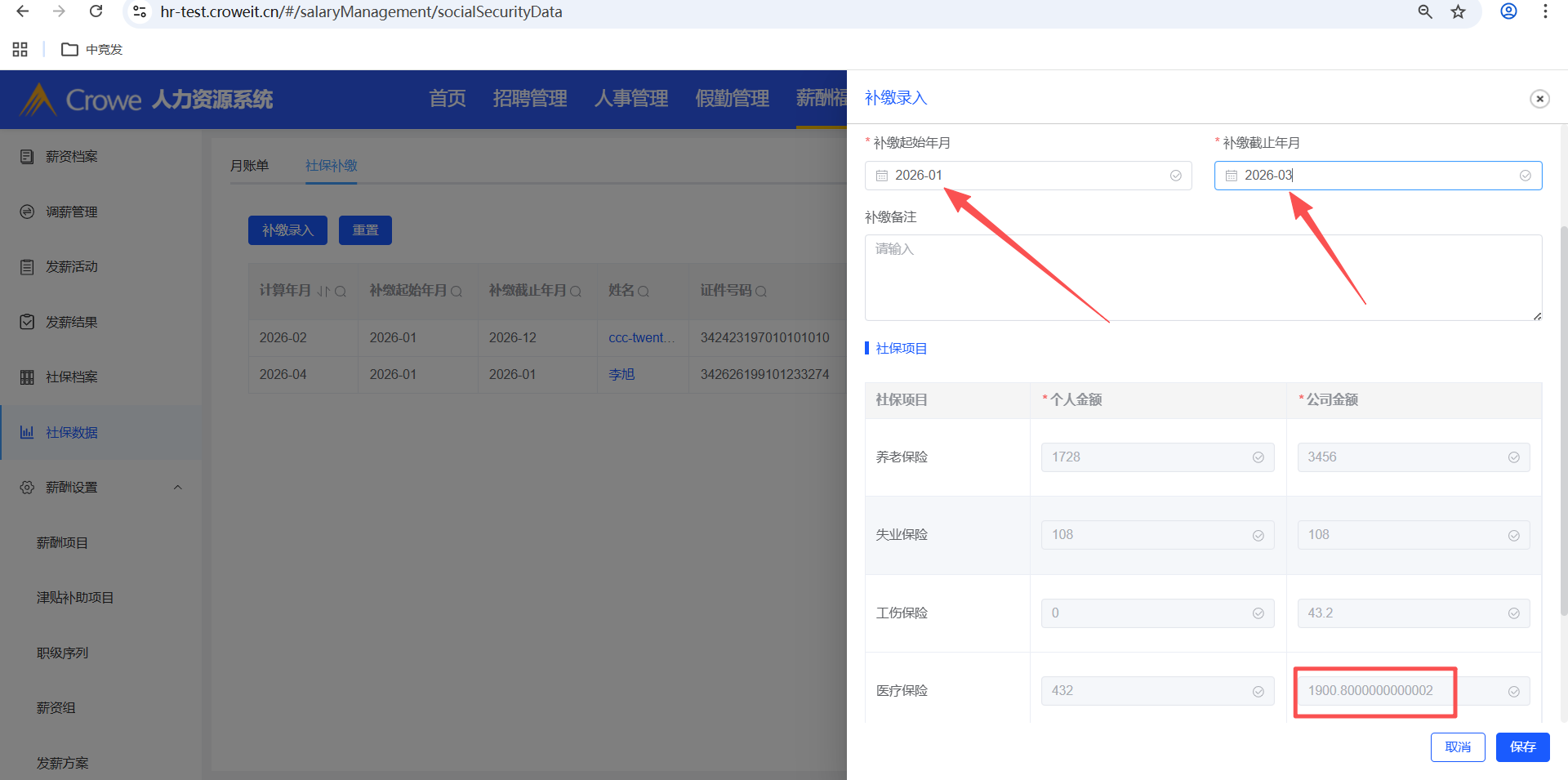 已关闭人力资源系统-薪酬福利管理-社保数据,社保补缴-社保录入抽屉,存在数据小数点位数过长