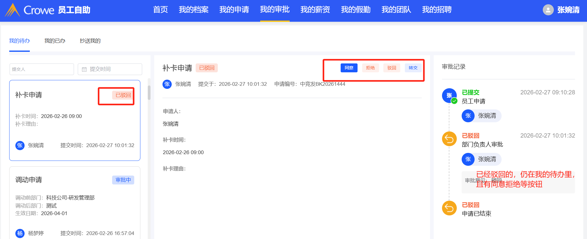 员工自助-驳回:已经驳回的仍在我的待办里,且有同意拒绝等操作