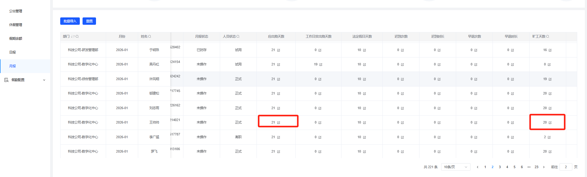 月报:1月应出勤天数21天,无任何其他请假出差记录,旷工只有20天