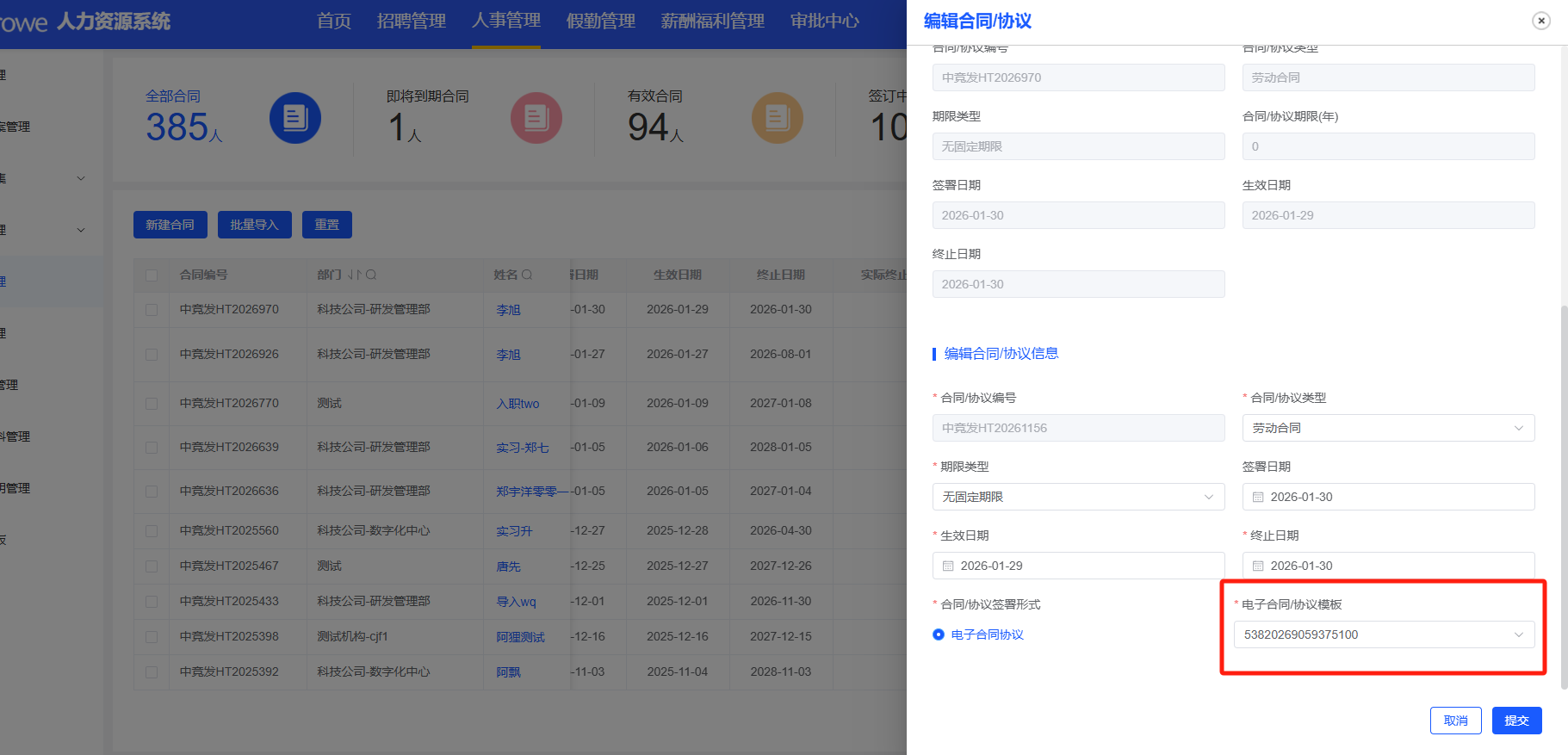 人事管理-合同管理:驳回/撤回后再编辑,电子合同/协议模板显示为数字
