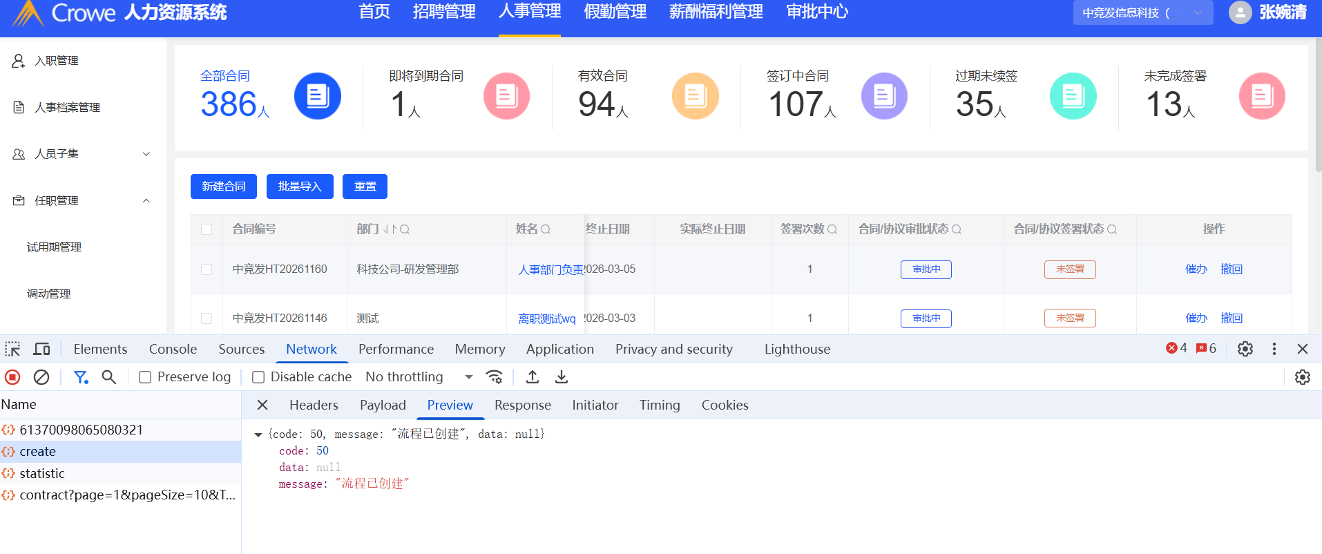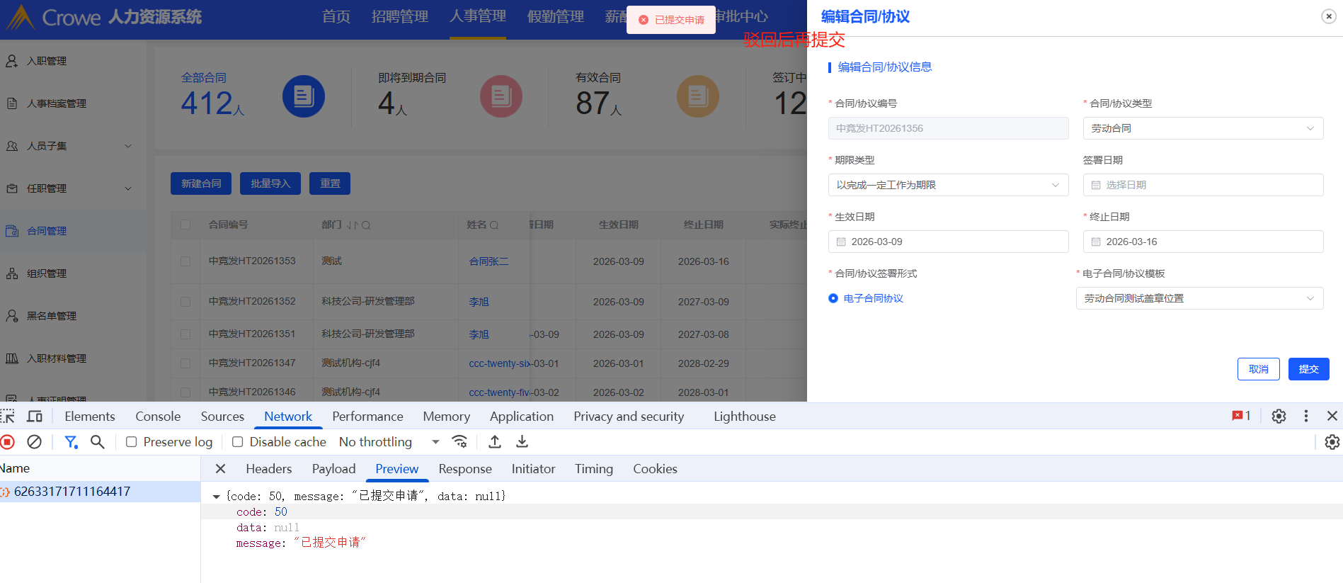 人事管理-合同管理:撤回/驳回后再次编辑提交,提示流程已创建