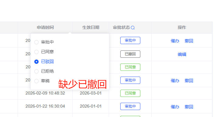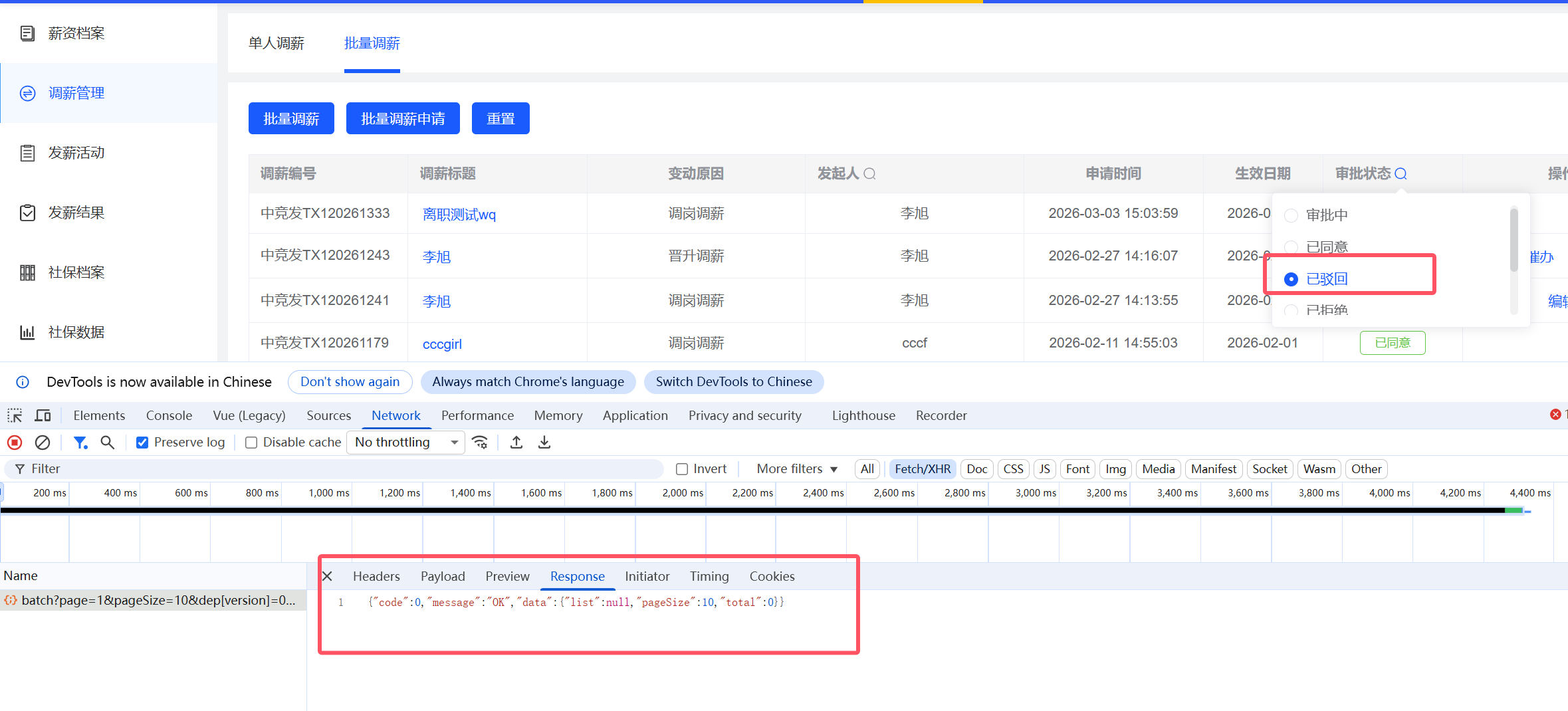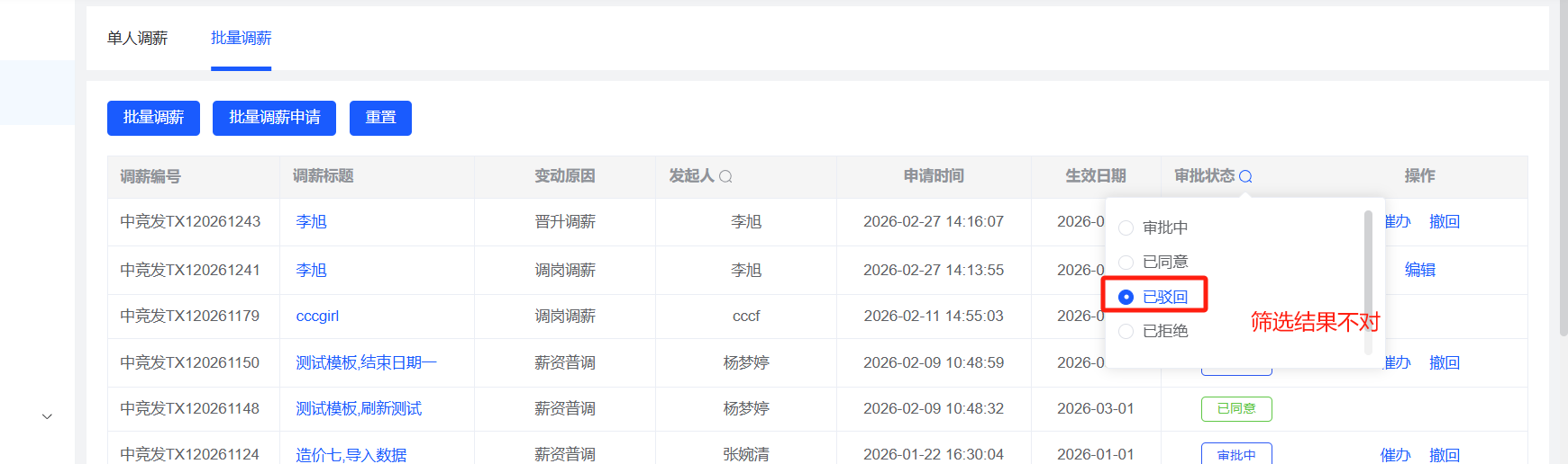 薪酬福利管理-薪资档案:批量调薪中,已驳回筛选的数据不对;缺少已撤回