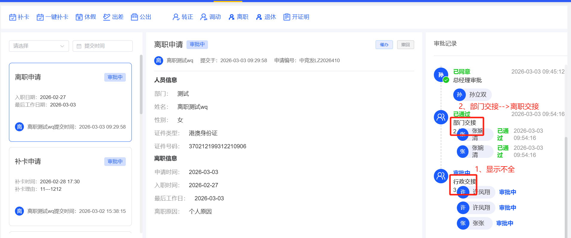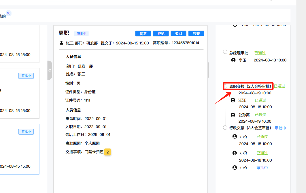 员工自助-离职审批:1、会签显示不全 2、部门交接改成离职交接(此处有部门交接和技术标准部交接两个)