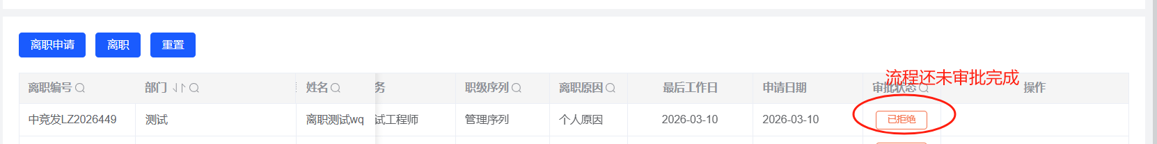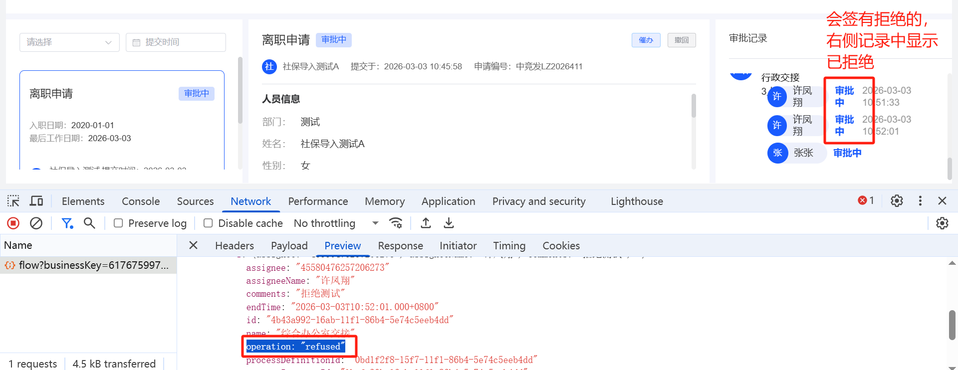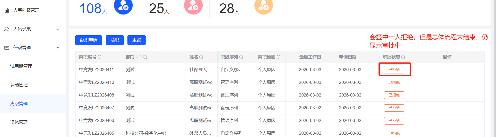 员工自助/人事管理-拒绝:1、会签其中一人拒绝后,右侧审批记录中对应的人显示已拒绝 2、会签未全部完成,人事管理列表中仍显示审批中
